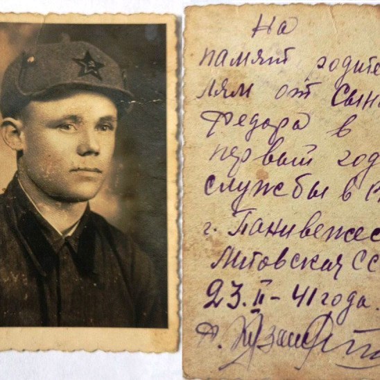 Участник Великой Отечественной войны! Род войск: Артиллерия. Воинское звание: Капитан. Воинская должность: Командир батареи. Награды: -Орден Красной Звезды (2) -Орден Отечественной войны I степени -Медаль «За победу над Германией в Великой Отечественной войне 1941—1945 гг.» -Юбилейная медаль «Двадцать лет Победы в Великой Отечественной войне 1941—1945 гг.» -Юбилейная медаль «Тридцать лет Победы в Великой Отечественной войне 1941—1945 гг.» -Юбилейная медаль «50 лет Вооруженных Сил СССР» -Медаль "За доблестный труд в ознаменование 100 летия В.И. Ленина". Кузьменко Фёдор Яковлевич, 1917 года рождения, родился в селе Захарьевка Першотравневого р-на Донецкой области в семье крестьянина. В настоящее время место его рождения с учётом всех территориальных изменений значится как РФ, Донецкая Народная Республика, Мангушский район, село Стародубовка. По национальности украинец. Образование 7 классов. Член КПСС 1941 года. Был женат. В 1932 году окончил 7 классов захарьевской начальной средней школы, после чего поступил ФЗО завода “Азовсталь” города Жданова, где её окончил в 1934 году. После окончания школы ФЗО работал токарем в депо паровозов завода “Азовсталь”. В 1940 году в декабре месяце, был призван в ряды советской армии. 22 июня 1941 года вступил в бой с немецко-фашистскими захватчиками. С мая по октябрь 1943 года был слушателем Днепропетровского артучилища, а с октября 1943г. по август 1944г. являлся слушателем 27 учебного офицерского артполка Сибирского военного округа. Во время защиты родины командовал артиллерийской батареей. Войну закончил в звании капитана. За защиту родины награждён 2 орденами Красной звезды. Был дважды ранен. В мае 1946 года, был демобилизован из рядов советской армии. С февраля 1947 года начал свою послевоенную трудовую деятельность в селе Захарьевка Першотравневого р-на Донецкой области. В дальнейшем работал на разных должностях колхоза "Заря" Першотравневого района, села Стародубовки. На всех участках, где трудился Фёдор Яковлевич, он с большой ответственностью относился к порученному делу. В 80-х годах прошлого века вышел на пенсию. Был также награждён многими юбилейными медалями, как ветеран ВОВ. Умер Фёдор Яковлевич 14.06.2001 году в селе Стародубовка.