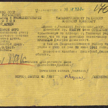 "Когда наш полк подошел походным порядком к городу Белый, - говорится в письме, - немецкая авиация обнаружила нас и стала бомбить. Мы шли передовыми в дивизии. Часть полка еще находилась в городе, а голова его была уже на переправе через речку, что протекала за городом. Майор Кузнецов руководил переправой и, несмотря на сильный обстрел и бомбежку, не ушел с речки до тех пор, пока полк не переправился на другой берег, и форсированным порядком тронулся в указанном направлении.