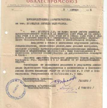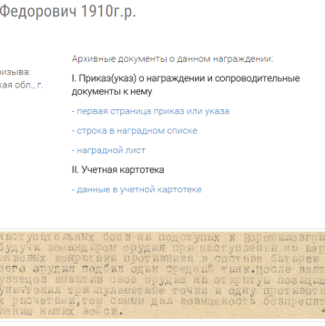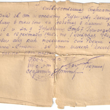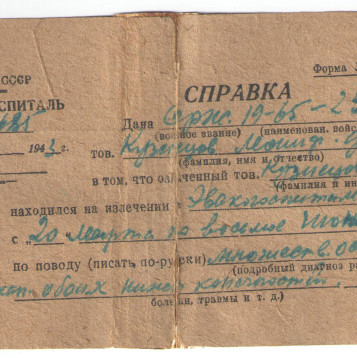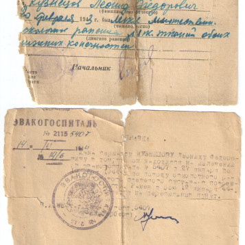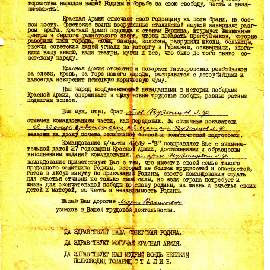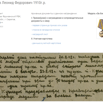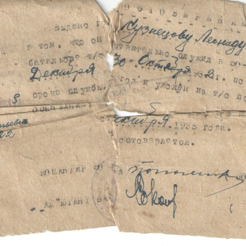 Мой дед КУЗНЕЦОВ ЛЕОНИД ФЕДОРОВИЧ родился 6 АВГУСТА 1910 года в деревне Гаврино Советского района Кировской области. В 1932 году призван Магнитогорским РВК для службы в рядах РККА (рабоче-крестьянской красной армии), отслужил. Закончил техникум по деревообработке в г. Семенов Горьковской области в 1939 году. Работал инженером по мебельному производству. Женился на моей прабабушке Колобовой Марии Васильевне, у него родился сын Вячеслав. А 30 июня 1941 года после объявления Фашистской Германией войны СССР его призвали в ряды РККА. С июня 1941 г по май 1942 г он был санитаром 87-го военно-санитарного поезда, а в мае 1942 года переведен в 179 стрелковый полк сначала стрелком, а затем командиром 76 мм орудия. Медаль «За боевые заслуги» мой дедушка получил за то, что в первый день наступления 20 августа 1942 года, будучи тогда наводчиком орудия, меткой стрельбой уничтожил один батальонный миномет противника и расчет второго миномета обратил в бегство. 23 августа 1942 года из пушки сержант Кузнецов точно накрыл снарядами пехоту фашистов и уничтожил при этом до 70 солдат и один пулемет противника. В марте 1943 года дедушка был первый раз ранен, у него были множественные осколочные ранения обоих ног. Бабушка рассказывала, что на фронте его оперировали прямо на поле боя, в медицинской палатке, без наркоза, дав выпить спирта для обезболивания. Наверное это была ужасная боль…А через 3 месяца он снова был в строю: командиром орудия все в том же 179 стрелковом полку. Свой подвиг он совершил во время наступательных боев на подступах к Ворошиловграду, как написано в приказе о награждении: тов. Кузнецов будучи командиром орудия при наступлении на аэродром отбил 4 танковых контратаки противника и лично сам из своего орудия подбил один средний танк. После взятия аэродрома тов. Кузнецов, выкатив свое орудие на открытую позицию, прямой наводкой уничтожил три пулеметные точки и одну противотанковую пушку с их расчетами, тем самым дал возможность беспрепятственному наступлению наших войск. За этот подвиг он награжден Орденом Красной Звезды, одной из самых высоких наград. А 12 января 1944 года снова ранение, на этот раз серьезное – осколком повредило левое плечо, повреждена кость. До середины июля 1944 года прадедушка находился в эвакуационном госпитале №5407 и оттуда после лечения его направили на службу в Управление Военно-автомобильных дорог командиром отделения контрольного пункта, где он работал до августа 1945 года, затем был переведен в Управление №7 Строительства ГУ Шоссейных дорог НКВД - зав. хранилищем ГСМ. Страну нужно было восстанавливать, дороги были на первом месте и демобилизоваться дедушке к жене и сыну удалось только в феврале 1946 года. Семья без него жила тяжело, в эвакуацию жена с грудным ребенком плыли по Волге на барже, у нее украли продуктовые карточки, и до места – глухой деревеньки Б. Гребеневка, они добрались истощенными. Чтобы получать паек, бабушке Марии Васильевне приходилось ежедневно в любую погоду добираться на работу пешком в другую деревню, оставляя грудного ребенка с полуслепой старушкой к которой их подселили. После войны дед пошел работать по своей специальности, он был столяром-краснодеревщиком. Профессия выручала: после работы он делал разную мебель: комоды, шкафы, табуретки, стулья, рамки для зеркал, а в выходной они с бабушкой на себе тащили это на 