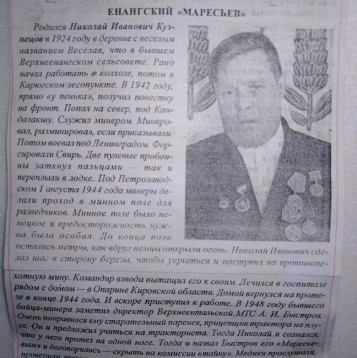 "Кузнецов в 169 батальоне с апреля 1943 года. За период пребывания неоднократно производил работы по минированию переднего края нашей обороны. Им обезврежено до 800 мин и поставлено около 250 мин. В период наступательных боев в июне, не смотря на трудности, встречаемые на пути, оставался бодрым. С марта производил работы по проделыванию проходов в заграждениях противника. ИМ БЫЛО ОБЕЗВРЕЖЕНО 68 НЕМЕЦКИХ И ФИНСКИХ МИН ВСЕХ ОБРАЗЦОВ.