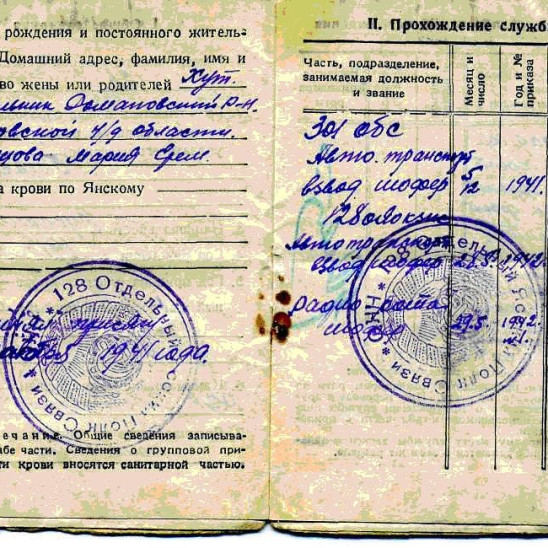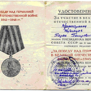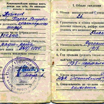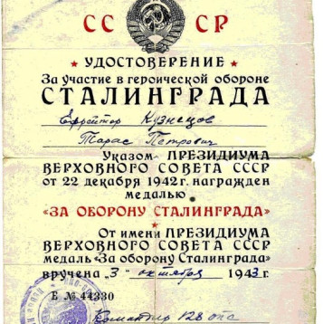 Кузнецов Тарас Петрович участвовал в боевых действиях в составе Сталинградского, Донского, Степного, Воронежского и 2 -го Украинского фронтов. С 5.12.1941г по 28.05.1942г проходил службу шофером автотранспортного взвода 128 отдельного полка связи . С 29.05 1942г служил в радиороте128 отдельного полка связи шофером. Демобилизован 26.04.1946г На фотографии со знаменем полка отец стоит с винтовкой у знамени, а на фото строя солдат он восьмой слева в первой шеренге.