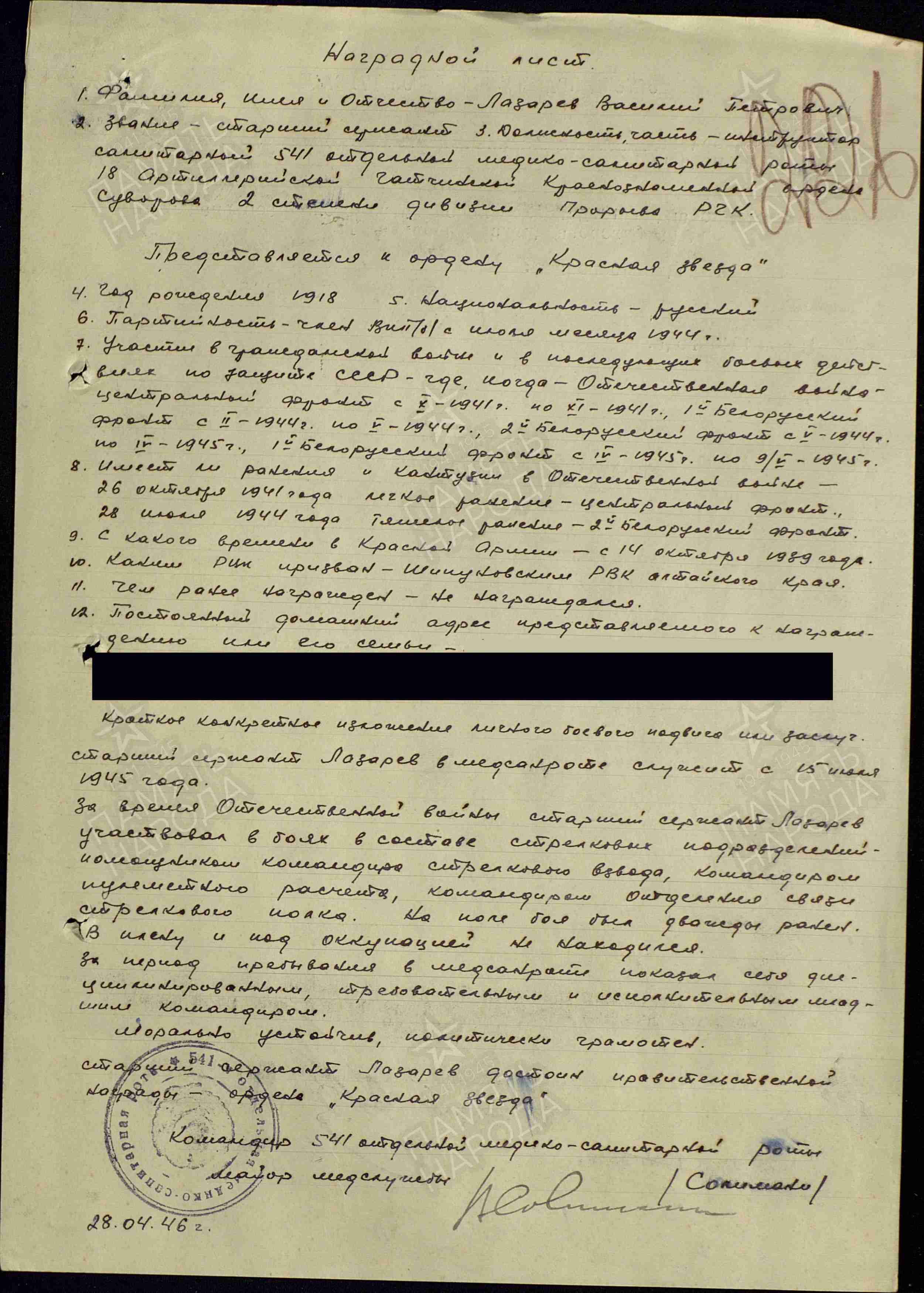 В красной армии с 1939 года. На начало войны старший сержант, служил в одной из сибирских дивизий. Часть переброшена под Москву осенью 1941 года. 26 октября 1941 года ранен в боях под Москвой. Прошёл всю войну. Освобождал Белоруссию. Представлен к награждению медалью "За Отвагу". Ранен в Польше в день подписания приказа о награждении, при жизни награду не получил. Брал Берлин.