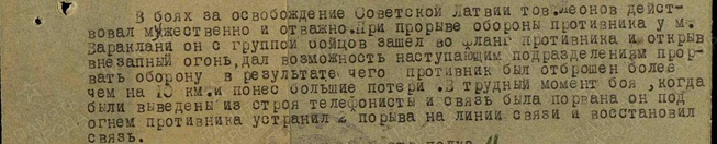 Между мной и моими предками, воевавшими в годы Великой Отечественной войны, огромный промежуток времени! Я многих не видел, они отдали жизни за нас, за мир. Но знаю точно, что их объединяло одно - прадеды не прятались за спины, чтобы увернуться от пули, честно выполняли свой долг перед семьей и Родиной. Когда в 1941 году на нашу страну напал враг, мои родственники, не раздумывая, ушли на фронт. Я хочу рассказать об одном из них, Леонове Сергее Семеновиче, так как в нашей семье хранится настоящая реликвия- пиджак с его наградами. Они- немые рассказчики подвигов моего прадеда. Родился Сергей Семенович 16 сентября 1918 года в Алтайском крае. В 1939 году его призвали в Красную Армию. И уехал он из Ленинска- Кузнецка во Владивосток. Отслужил, демобилизовался, переехал в Алма-Ату. Были большие планы. Но им не суждено сбыться. 22 июня 1941 года немецкие бомбы обрушились на наши города и села. Объявили всеобщую мобилизацию. Страшно. Еще вчера было тихо и спокойно, а сегодня война…Это страшное слово облетело всю страну, охватило всех до единого. Никто этого не ожидал. Неизвестность. Что будет завтра? 11 июля 1941 года Сергей Семенович был на призывном пункте, он понимал, что нельзя просто сидеть и ждать, бежать куда-то и бояться. Нужно взять себя в руки и бороться за свободу, за жизнь, за Родину. Это- единственно правильный путь. На фронте он был пулеметчиком 54 полка 44 –й горно-кавалерийской дивизии. Полк прадеда защищал подступы к Москве. В битве под Москвой за деревню Крюково из своего пулемета Сергей Семенович уложил больше 25 гитлеровцев. В боях под Брянском во время прорыва обеспечил связь между ротой и батальоном. Там он получил ранение в обе ноги. Медсестра, совсем еще девчонка, выбиваясь из сил, вытащила его с поля боя. Вместе с другими ранеными прадеда отправили в госпиталь. Не знаю, как я бы себя повел, когда вокруг рвутся снаряды, неба не видно из-за пожара, пули свистят над головой, кося товарищей. Об этом подвиге говорит награда- медаль «За отвагу». Подлечившись, прадед опять вернулся на фронт, воевал в 37-м полку 12-й гвардейской дивизии. Отучится на сборах снайперов. И опять получил ранение, теперь в голову, но война для него на этом не закончилась. Впереди и Орловско-Курская дуга, и город Орел. У прадеда будет еще ранение- в левое бедро. Госпиталь. Затем 237 полк 37-й стрелковой дивизии. Потом еще одно ранение – в живот. И опять повезло- не смертельное. Прадед его получит, освобождая Латвию. В наградном листе описан подвиг Сергея Семеновича. Он действовал мужественно и отважно. При прорыве обороны с группой бойцов зашел во фланг противника и, открыв внезапный огонь, дал возможность наступающим подразделениям прорвать оборону, в результате чего противник был отброшен более чем на 10 километров, понес большие потери. В трудный момент боя, когда были выведены из строя телефонисты, и связь была прервана, он под сильнейшим огнем противника устранил два порыва на линии связи. За выполненное задание прадед был награжден еще одной правительственной наградой. На груди засиял орден Красной Звезды. В 1944 году шли ожесточенные бои. Враг сопротивлялся. Фашисты никак не могли поверить, что могут быть разгромлены советской армией. В октябре 1944 года прадед на всем протяжении боев обеспечивал бесперебойную связь штаба батальона с действующими подразделениями, чем давал возможност