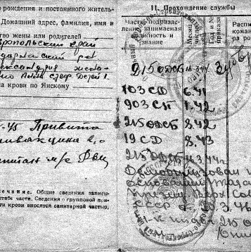 ходе боев за Ельню отец получил ранение правой ноги и отправлен госпиталь №2040.Со слов отца, бои за Ельню самые страшное время за всю войну.В феврале 1942 года отец был зачислен в 903 СП 242 стрелковой дивизии 2-го формирования, которая согласно Директивы Ставки ВГК №170220 от 05.04.1942г.включена в резерв ВГК и направлена в Сталинград, но в мае 1942 г. вошла в состав 38 Армии и принимала участие в Харьковской операции в районе города Волчанска. В августе 1942 года отца зачисляют в 215 отдельный дорожно- строительный батальон и он принимает участие в Сталинградской битве. В августе 1943 г. отца зачисляют398 СП 118 СД, входившая в 28 Армию Южного фронта, и принимает участие в Миусской и Мелитопольской операциях.1октября 1943 г.отец получил ранение руки и включен в списки потерь личного состава как убитый в районе с. Зеленый Луг. Октябрь-ноябрь 1943 г. находился в госпитале №2343. 118 стрелковая дивизия стала именоваться 118 Мелитопольская Краснознаменная ордена Кутузова стрелковая дивизия. В марте1944 года отец вновь зачислен в 215 ОДСБ, который 6 октября 1944г. включен в состав 14 Армии Карельского фронта, и принимал участие в Петсамо-Киркенесская наступательной операции. Участие