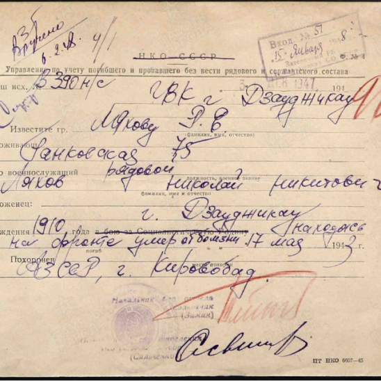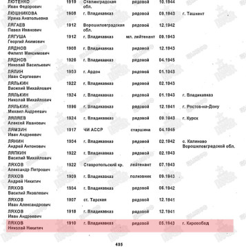Боевой путь ветерана Мой прадед Николай Никитич родился в 1910 году. Дата и месяц не известны мне. Жил в г. Орджоникидзе на улице Галковского 75. У него была жена Раиса Ефимовна 25.07.1910 года рождения и сыновья. В 11.02.1943 прадед был призван рядовым в спец лагерь НКВД. Находясь на фронте, умер от болезни 17.05.1943 года. Я застала свою про бабушку Раису, которая умерла 10.11.1989 года и была похоронена во Владикавказе и ее сына, моего деда Николая Николаевича Ляхова 07.12.1934-31.08.1992 гг. Похоронен рядом с матерью.
