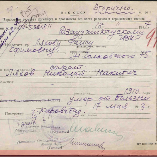место смерти: АЗССР Г. Кировобад