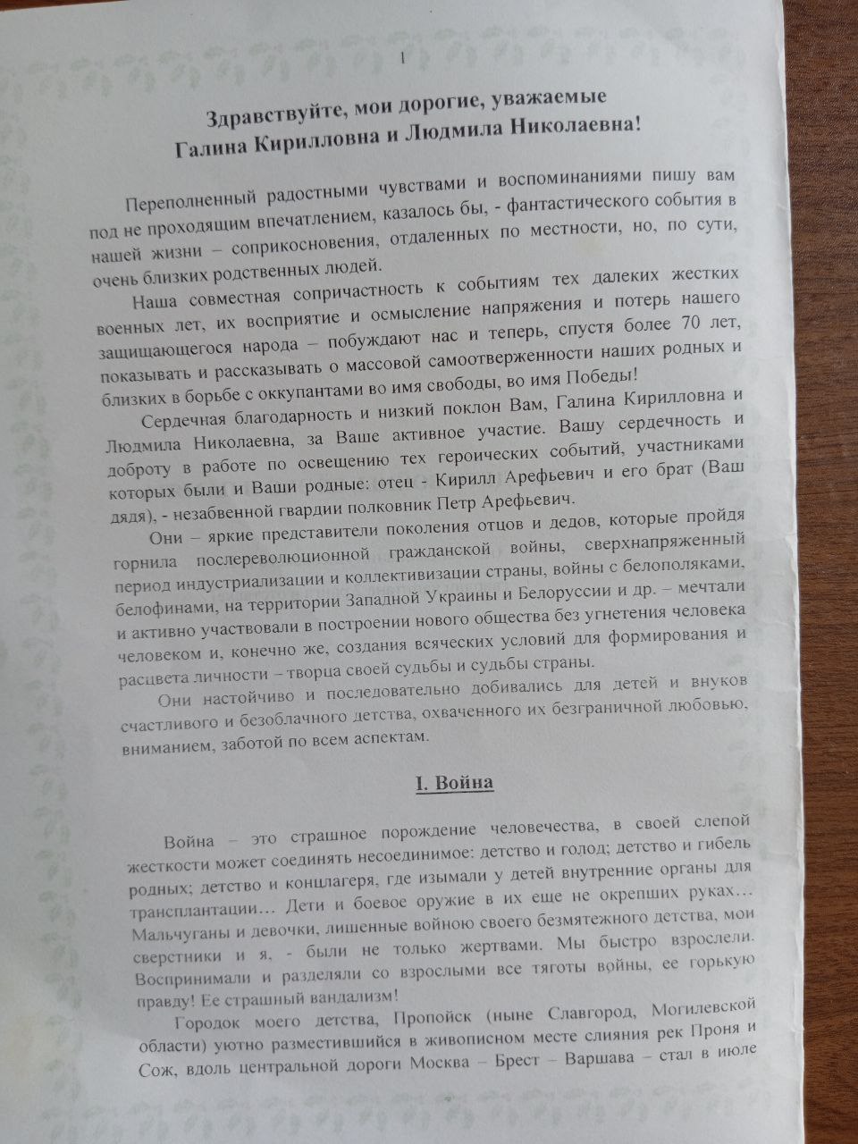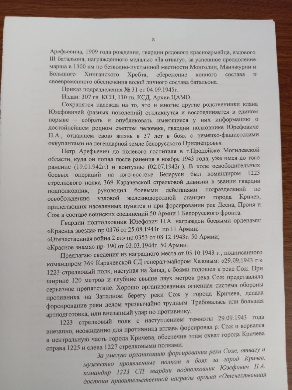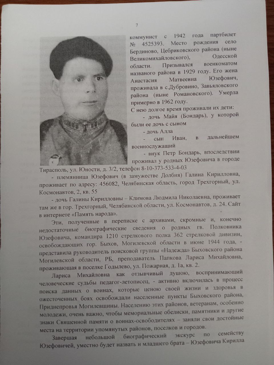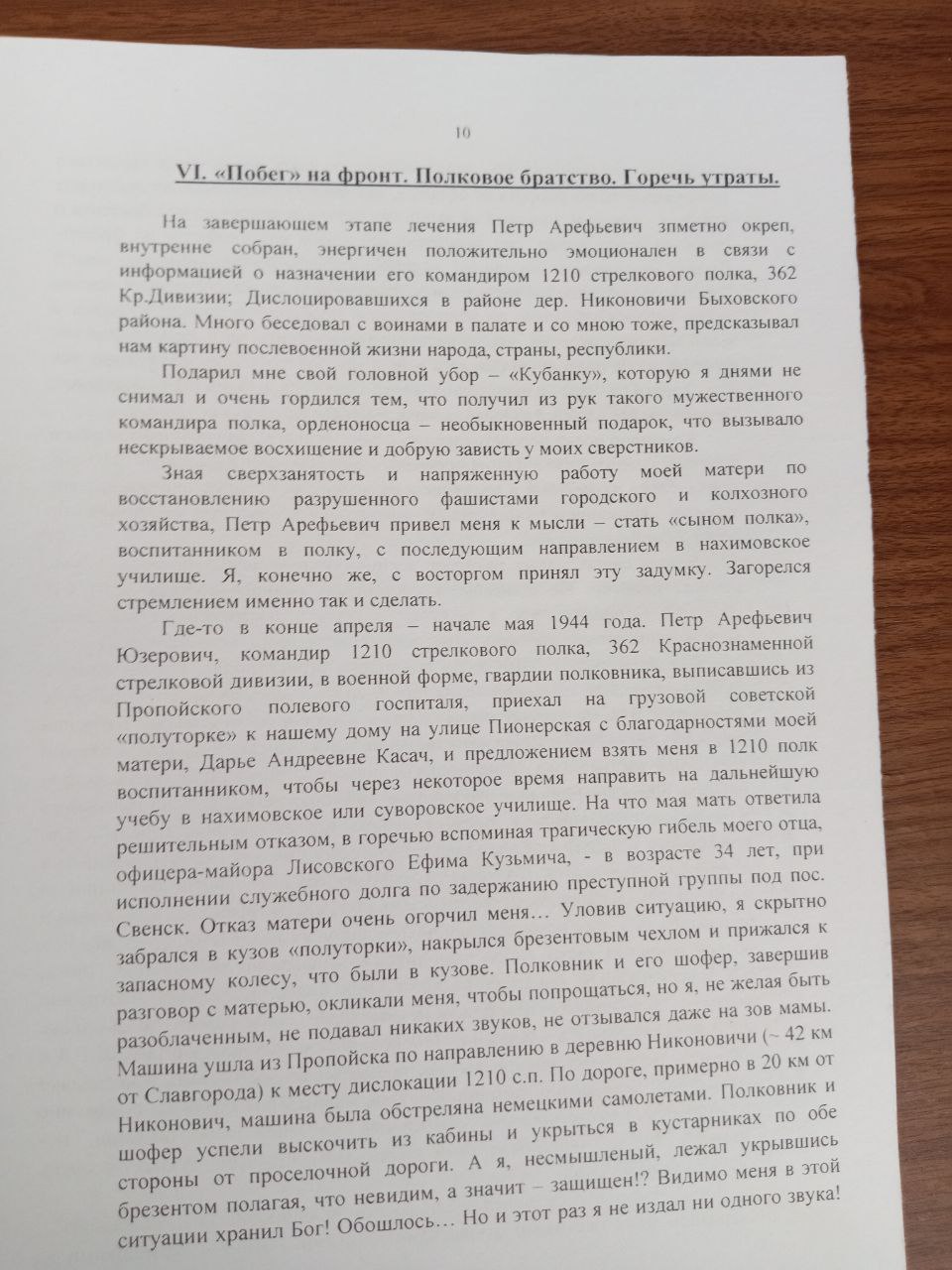 В 1941 семью мать сестру (6лет) и Владимир (9лет) эвакуировали ж/д Кричев. со станции Кричев их и другие семьи отправили на станцию Уничи где были сосредоточены воинские части. через некоторое время начался кромешный ад, ожесточённая бомбёжка военных подразделений, техники, беженцев. мать толкнула нас в воронку от бомбежки и накрыла собой и сказала что сирот не будет умрем вместе. Когда бомбежка начала затихать нас и остальных беженцев начали в быстром порядке эвакуировать, запихнули в поезд и отправили за 30 км от Уничи. позже мы оказались на ж/станции Вревская в Узбекистане нас принесла семья, 25 ноября 1943-м году мы вернулись обратно. моя семья и друзья проживали не далеко от госпиталя и мы ходили помогали раненым, топили печки, читали письма, делали перевязки раненым бойцам. Петр Арефьевич командир 1210 стрелкового полка 362 Кр.Дивизии подарим мне свой головной убор Кубанку синего цвета. В начале мая 1944 г Петр Арефьевич Юзирович командир 1210 хотел меня забрать меня на войну но мать не отпустила, пока они разговаривали я спрятался в грузовой светлой полуторку, и когда мы уже отъехали 42 км от Пропойска и оставалась примерно ум 20 до дислокации машину обстреливали с воздуха, я не смышленый лежал в машине и не издавал не звука. когда мы прибыли на место дислокации я грязный и перепутанный вылез из полуторки (машины), меня конечно сначала хотели вернуть обратно но не рискнули т.к. дорога обстреливали с воздуха немцы, было принято решение что я остаюсь в личном составе 1210, мне выдали самою маленькую военно-полевую форму, а через 7-10 дней мне вручили пистолет Вальтер. так я и стал сыном полка. напечатал книгу ДЕТИ ВОЙНЫ, ее ЭХО И ПАМЯТЬ