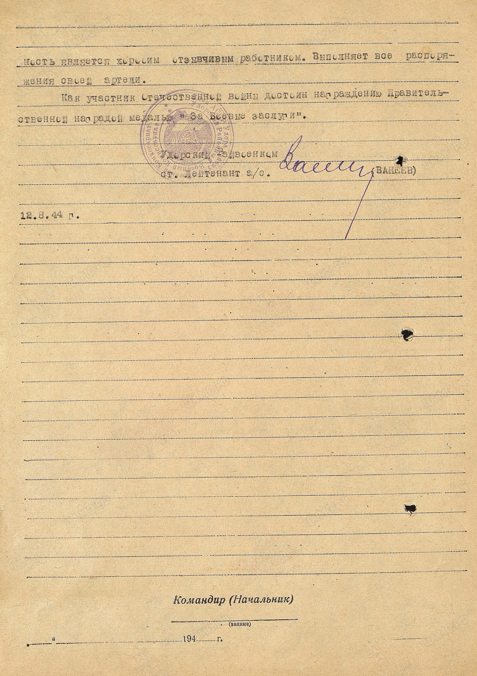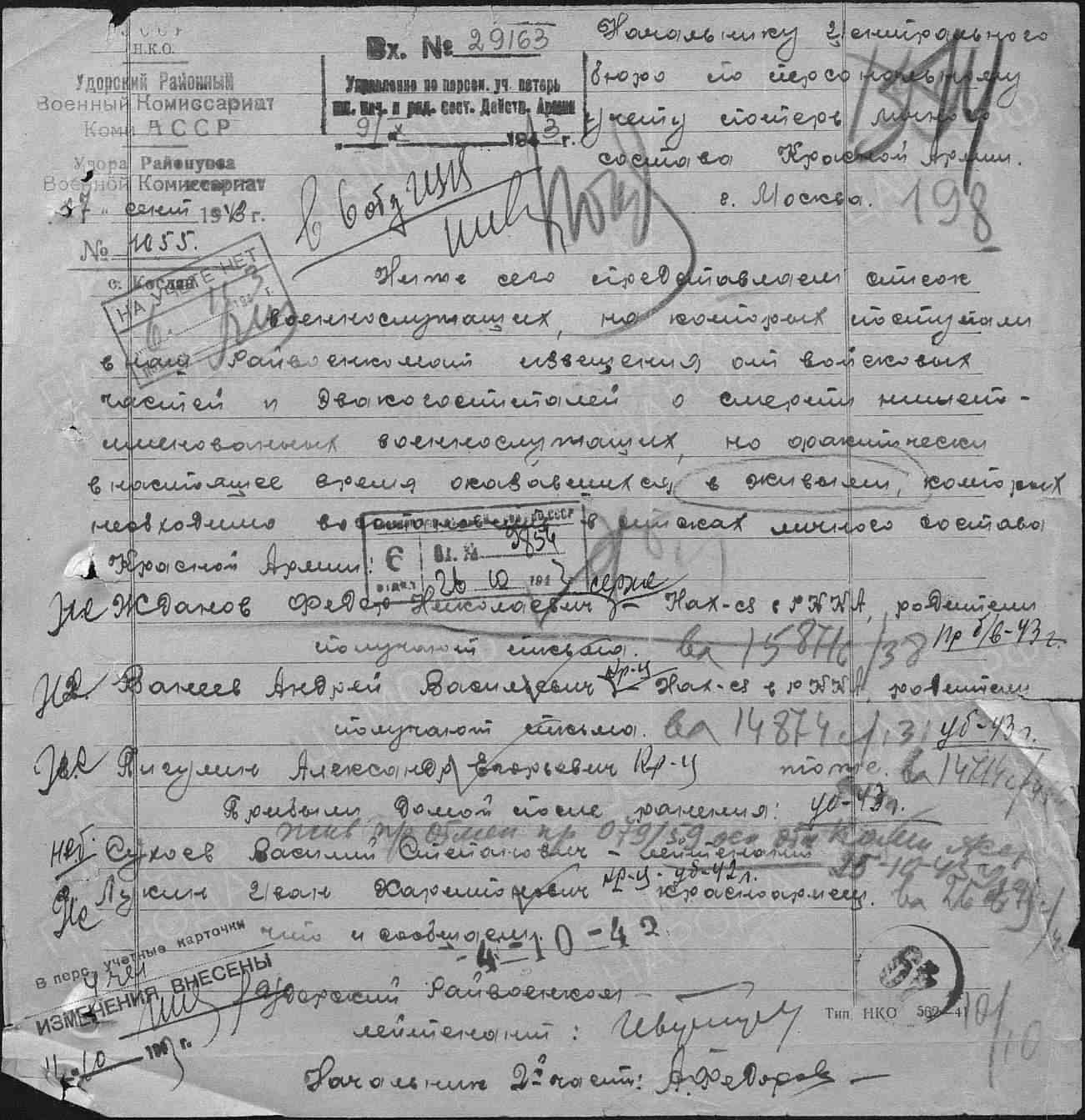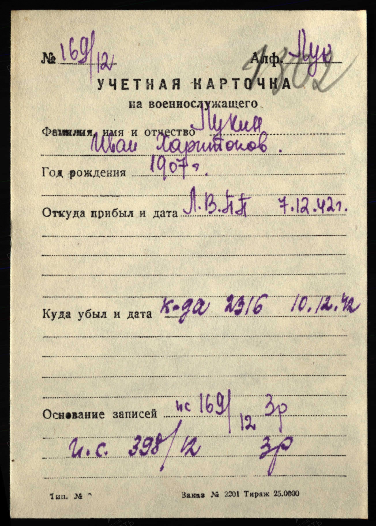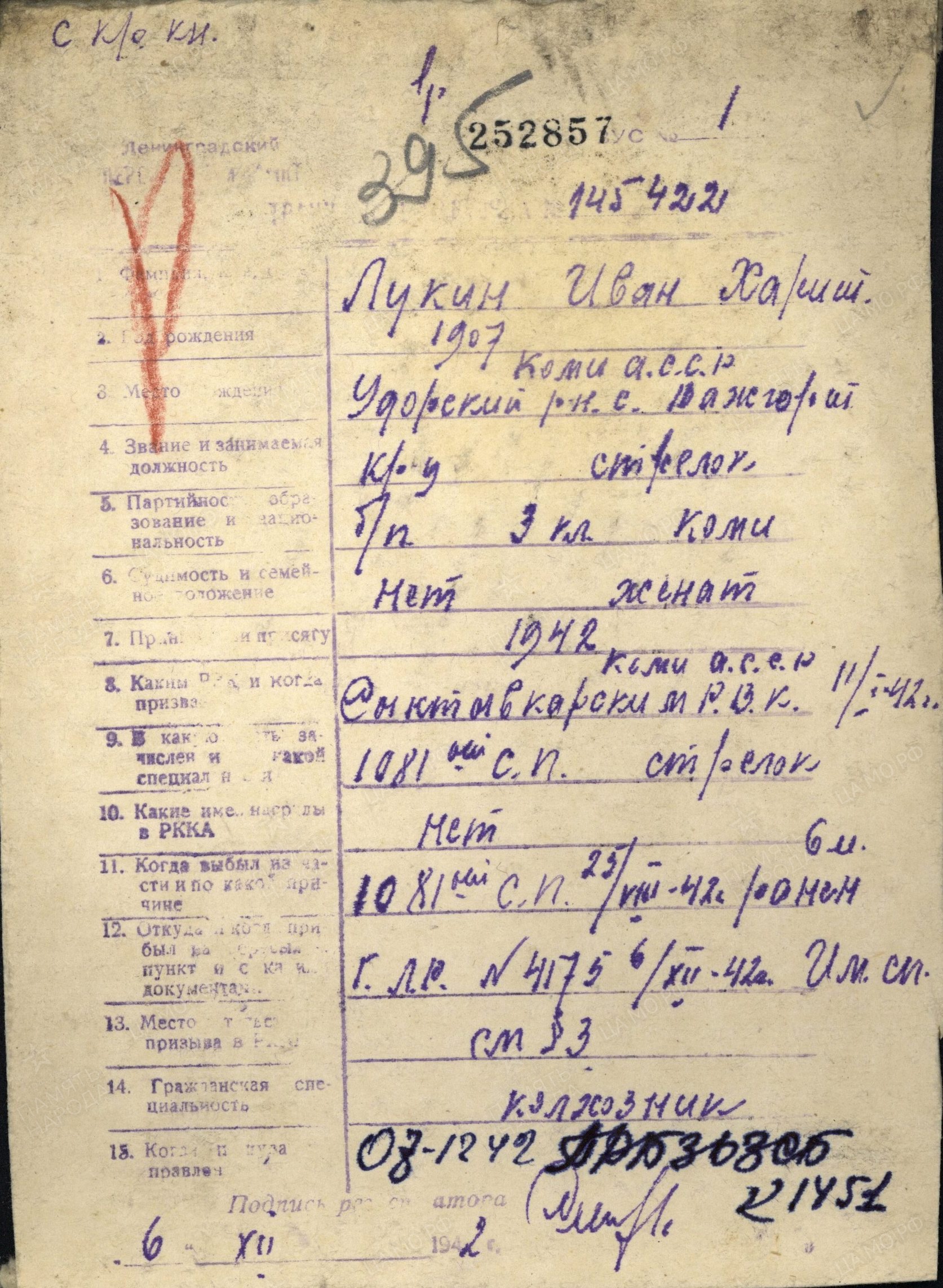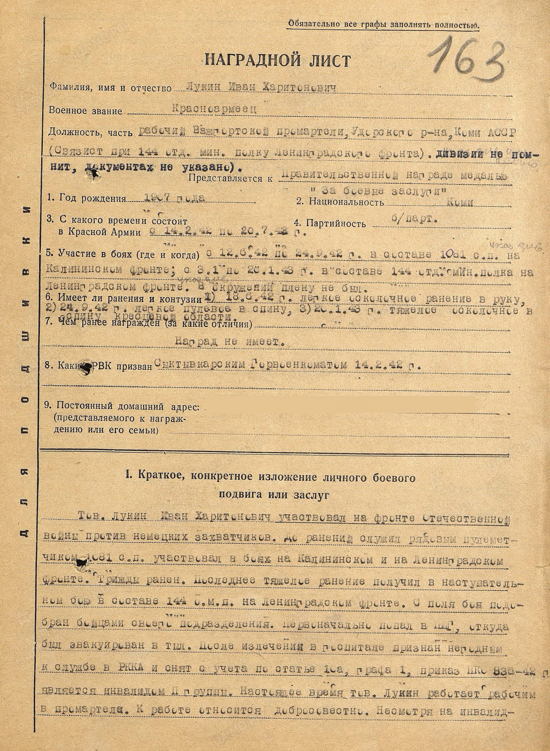 Лукин Иван Харитонович,26.09.1907-23.11.1946г.р.- мой дедушка. Родился в с. Важгорт Удорский р-н Коми АССР. Жена Попова (Лукина) Августа Андриановна. До войны дед работал в колхозе «Партизан» бригадиром полеводства. На войну был призван 11.01.1942 Сыктывкарским РВК, Коми АССР, г. Сыктывкар. Дата поступления на службу 14.02.1942. Воевал в 1081 СП 312 дивизии и в 144 оминп 28 дивизии на Ленинградском Фронте. Принимал участие в боевых действиях на Смоленщине, д.Прилепы Кармановского р-на. После этих боев Лукин Иван Харитонович был ранен и ошибочно причислен в погибшим. Попал в госпиталь. После лечения в начале декабря 1942 года он снова был отправлен на фронт в качестве связиста в составе 144 отд.мин.полка 28 дивизии Ленинградского фронта. Здесь он получил тяжелое ранение в спину, был комиссован и инвалидом 2 группы отправлен домой. В последующем (09.1943года) Удорским РВК было написано сообщение в Центральное бюро по персональному учету потерь личного состава Красной Армии в г. Москва о том, что оказались живыми следующие красноармейцы, в том числе указан и мой дед. Бабушка получала 3 похоронки на мужа. Он был трижды ранен, но, главное, живой. Дедушка вернулся и начал работать на локомотиве в сельхозартеле с.Важгорт Удорского р-на Коми АССР. Лукин Иван Харитонович 12.08.1944 года был представлен к награде Удорским РВК, а 06.08.1946 года был издан указ№ 504/57 Президиума Верховного Совета о награждении орденами и медалями СССР офицерского, сержантского и рядового состава, в том числе и моего деда (стр.110 Указа).