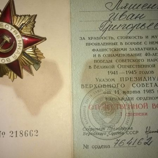 Мой дедушка - красноармеец Ляшенко Иван Григорьевич, 07.02.1919 г.р., был призван в кавалерийский корпус сразу после начала войны. В 1944 году получил тяжелое ранение. В медчасти его приняли за умершего и положили на груду трупов погибших солдат. Когда принесли в морг очередного умершего, выяснилось, что солдат Ляшенко живой. Дедушка рассказывал: как шли в бой за Родину, за Сталина; как верили в Победу; про настоящую дружбу и любовь. Инвалидом 2 группы дедушка работал в тылу. За боевые заслуги перед Отечеством и самоотверженный труд был награжден Правительством. Хотя жил он от нас далеко, каждое лето мы приезжали к нему в гости и он рассказывал о войне. Нет, скорее - о Победе над фашизмом! Умер он в мирное время 11 апреля 2013 года в Украине, Донецкой области, г. Амвросиевка. Не дожил до чудовищных событий, происходящих в настоящее время на Украине. Мы, дети, внуки и правнуки, гордимся нашим Героем! Спасибо тебе, наш родной! Мы помним!