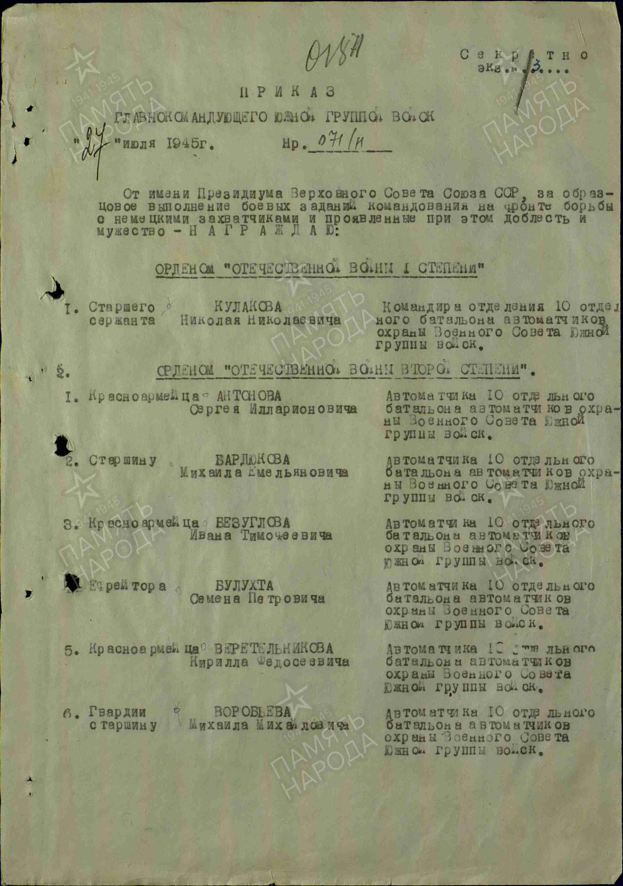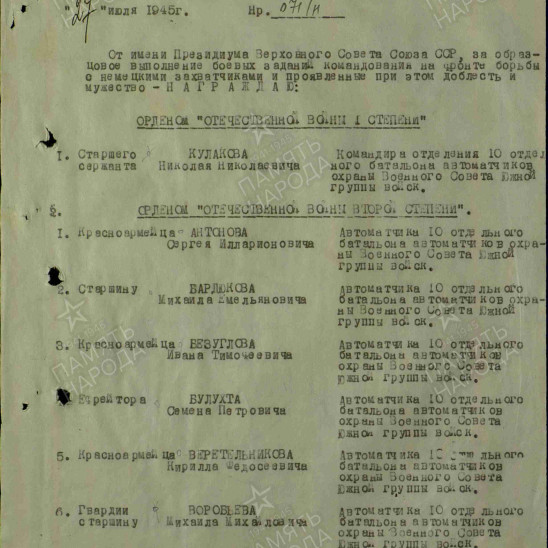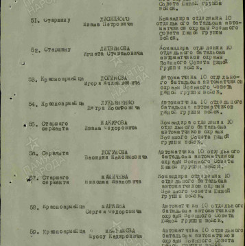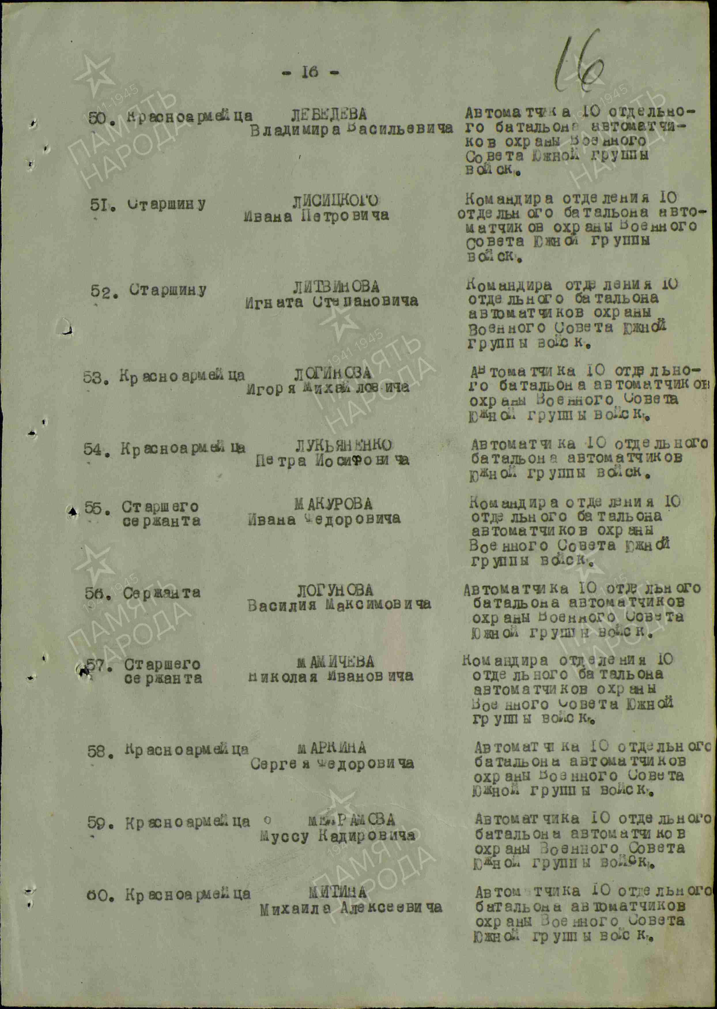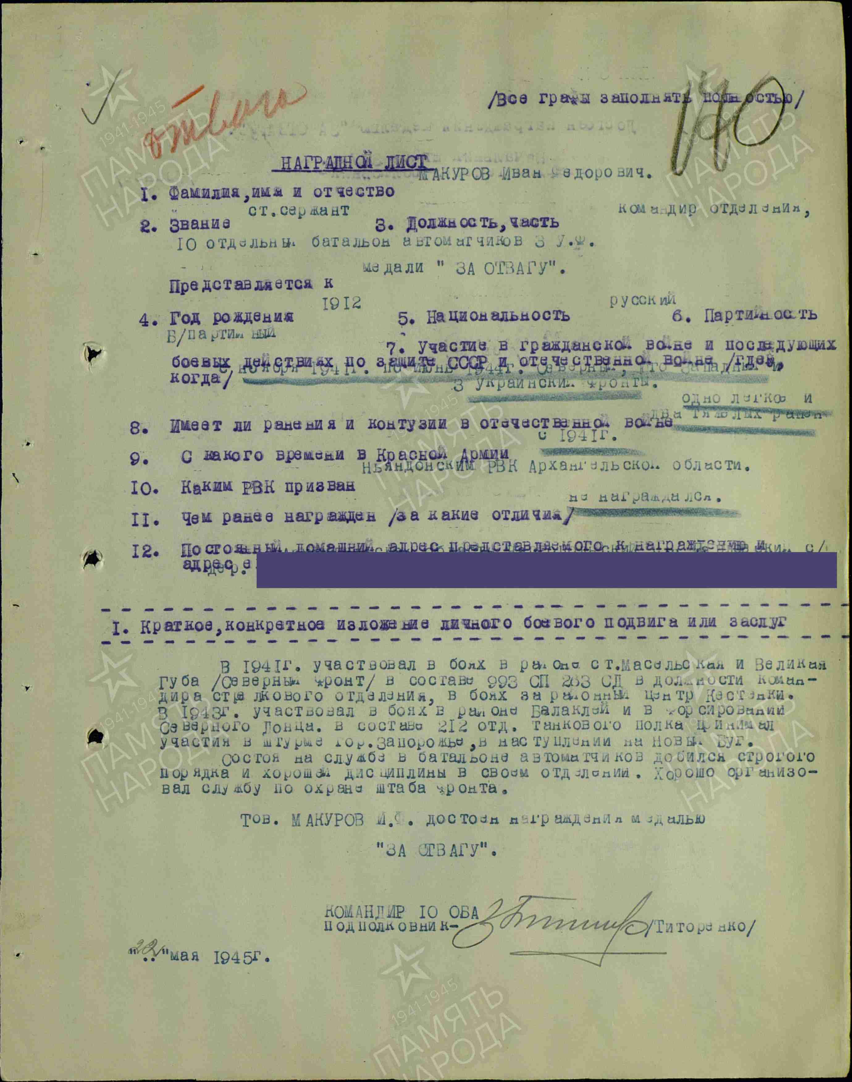 Макуров Иван Федорович 28.08.1912 - 28.10.1985г. г. Архангельская область, Каргопольский район, Павловский сельский совет, деревня Репаково. Воинское звание старший сержант. В 1941 участвовал в боях в районе станция Мосальская и Великая губа на Северном фронте в составе 993 стрелкового полка 263 стрелковой дивизии в должности командира стрелкового отделения в боях за районный центр Кестенки. В 1943 г. участвовал в боях в районе Балаклей и в форсировании реки Северного Донца, в составе 212 отделения танкового полка принимал участие в штурме города Запорожье, в наступлении на Новый буг. Был командиром отделения 10 отдельного батальона автоматчиков охраны Военного Совета Южной группы войск 3 Украинского Фронта. Воевал 1941 - 1945 г. г. Был 2 раза ранен. В 1945г. был награжден медалью "За отвагу". В честь 40 летнего юбилея Победы в ВОВ юбилейным орденом Отечественной войны 2 степени.