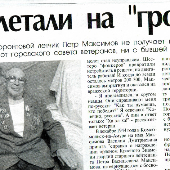 В 1940г. из судостроительного техникума забрали в армию.Определили в Бирмскую авиашколу. Учился до 42г. летать на истребителях. В мае 42г. 9 наиболее успевающих отправили на северо-западный фронт. Там летали на "ЛАГГ-3" - (лётный авиационный гарантированный гроб - 5 кубометров дров, 3 пуда клея).Из 9 чел. остался в живых один(за период с мая по октябрь 42г. Немцы в небе издевались как хотели - гонялись как кот за мышкой. У них скорость 500км/ч, у нас 350. И пулемёты не стреляли(то перекос, то заедание...). Как приехал СМЕРШ, пушки стали стрелять аккуратно. 26.10.42г. над г. Старая Русса возле линии фронта "месершмит" попал пушечным снарядом сверху мимо уха в штанину левого бедра и в бензобак. Самолёт вспыхнул мгновенно. Сумел расстегнуть ремни, ручку управления отдать вперёд, самолет пошёл по кривой вниз, а сам остался сверху. От бензина и ветра загорелся ватный комбинезон. Пламя охватило всё тело.Обгорела нога, где пролетел снаряд, лицо, кисти рук, тело - куда проникло пламя. Упал рядом с лужей, а парашют тянет в сторону. Отстегнулся и в лужу. Хотел идти сам, но нога так обгорела, что кожа и мышцы стянулись и ногу нельзя было разогнуть. Наши быстро прибежали. Лечился полгода. Уже в 43г. отпустили на фронт.Снова стал летать. Ещё раз на боевом вылете подбили. Снаряд попал по приборам в мотор и резануло по щеке. Самолёт вошёл в штопор, но сумел вывести и сесть на свой аэродром. Девчонки-оружейницы плачут: "Макс, у тебя кровь". Однажды над Ригой был бой. 60 русских и 50 немецких истребителей. В этом бою было сбито 17 немецких самолётов. Наших было сбито 3. Я сбил свои первые 2 самолёта.Однажды подавил огневую точку. С земли стрелял зенитный пулемёт.За это получил орден отечественной войны. 3-й сбитый самолёт отобрали: долго стрелял в 2х "фокеров". Наконец одного подбил. Тот кувыркнулся. Упал ли он - не смотрел, т.к. потерял из виду ведомого Ивана. А он, оказывается смотрел куда упадёт сбитый самолёт. В это время его самого сбили(встретился с ним почти через год в Алкино, где была проверка после плена). Горбунов(командир эскадрильи) присвоил сбитый самолёт себе(Я, говорит, стрелял). 4й сбитый самолёт мне обеспечил ведомый, поэтому я сказал, что это сбил он. Не было страсти присваивать себе сбитые самолёты. 5 и 6 самолёты не докажешь, т. к. сбиты были в групповом бою. Стреляли все. 24.10.44г. за 6 месяцев до окончания войны был сбит.Ведомый пропал. Самолёт весь изрешетили, но мотор работал. Сесть было невозможно и когда до земли осталось 200м - выбросился. Оказалось на чужую территорию. Остался жив, но попал в плен. Бежал, кормил латыш. Его угнали в Германию, меня поймали. Отправили в Дахау.Работал на фарфоровой ф-ке. Бежал. Поймали с собаками. Концлагерь "Ляйтмериц". Бежал. Успешно. Тут и война кончилась. К лётной работе не допустили. Страшный голод преследовал. На работу не брали(как в фильме "Чистое небо"). Помогли друзья. Работал в пожарной авиации главным летнабом(лётчиком-наблюдателем)