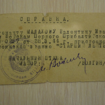 Малахов валентин Иванович закончил Тамбовское пехотное училище. Призван на фронт Иртышским ВВК Казахской ССР ( Павлодарская область, Иртышский район) Место службы 10 ОПРОС 531 сп 327 сд.