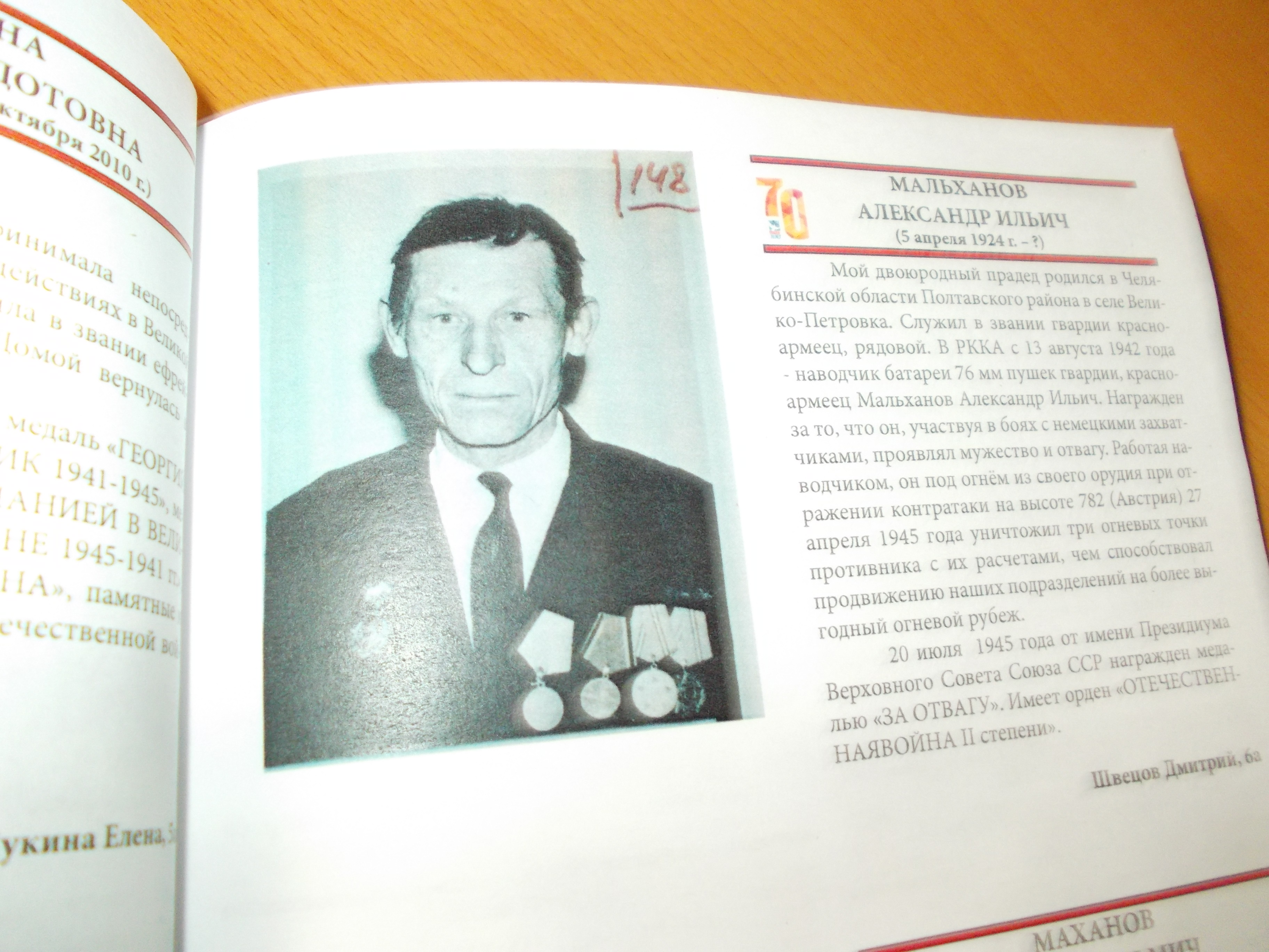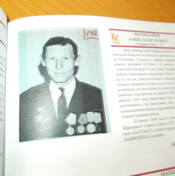 Александр Ильич Мальханов - мой двоюродный дядя. Был призван в РККА в августе 1942г. Служил в артиллерии, наводчиком батареи 76мм пушек. У него 5 детей, 14 внуков и 21 правнуков.