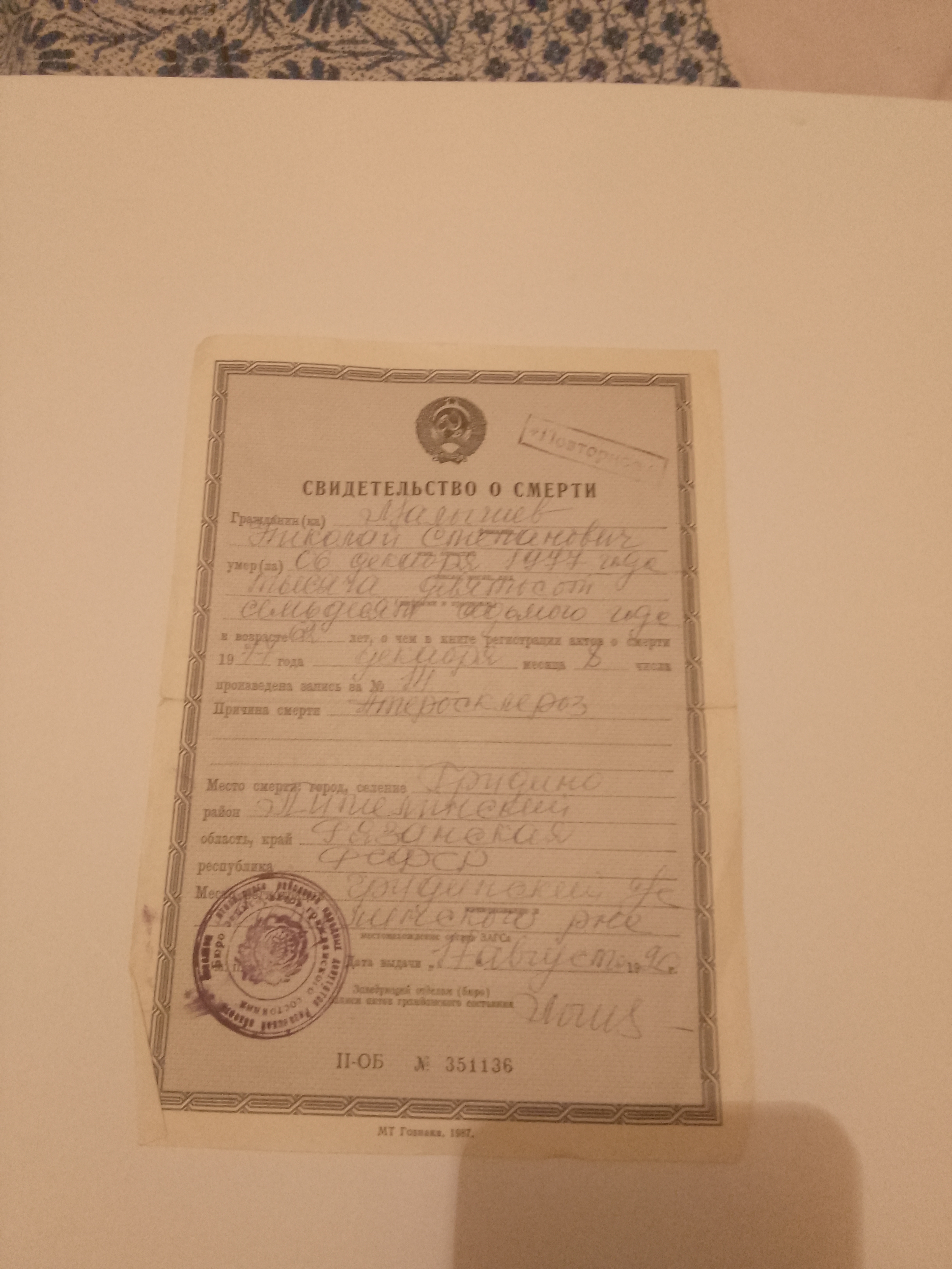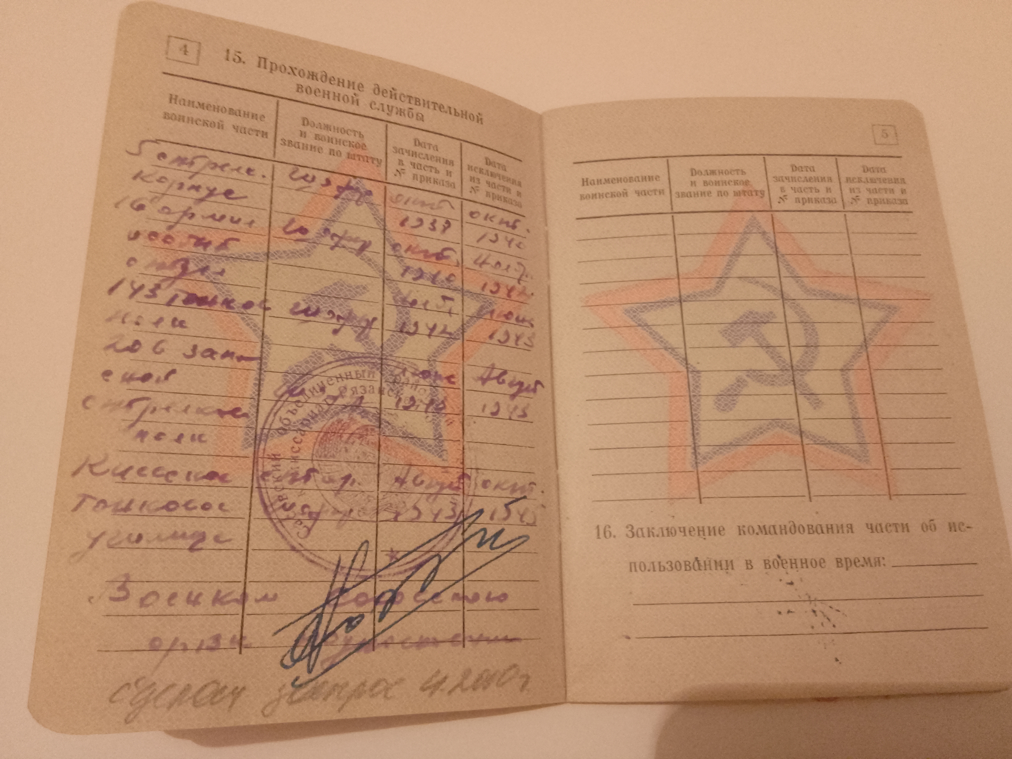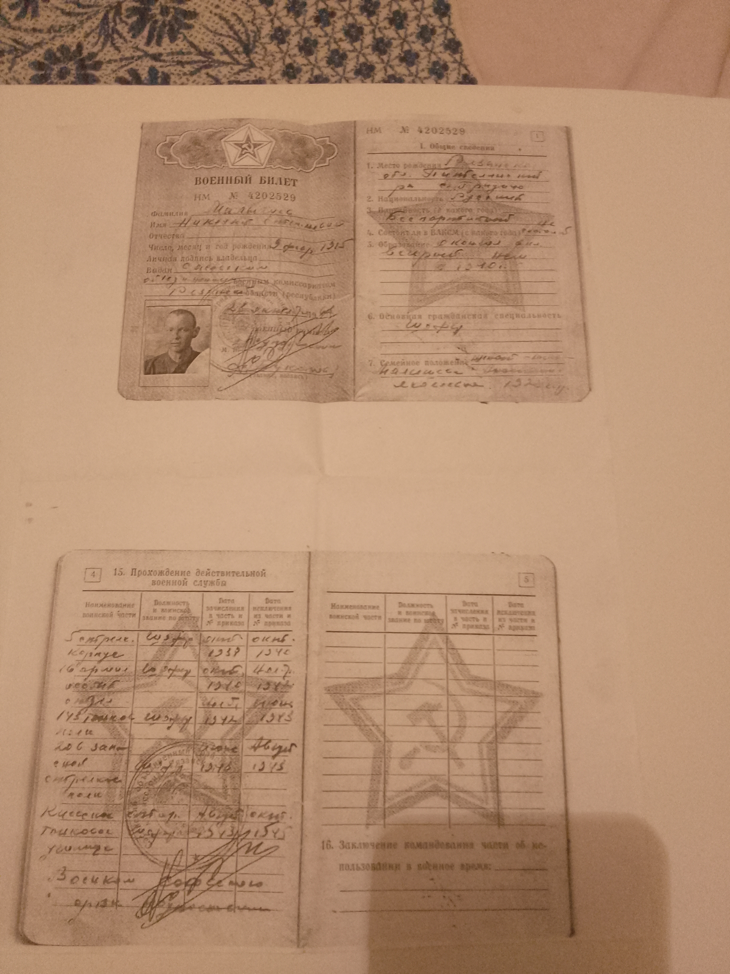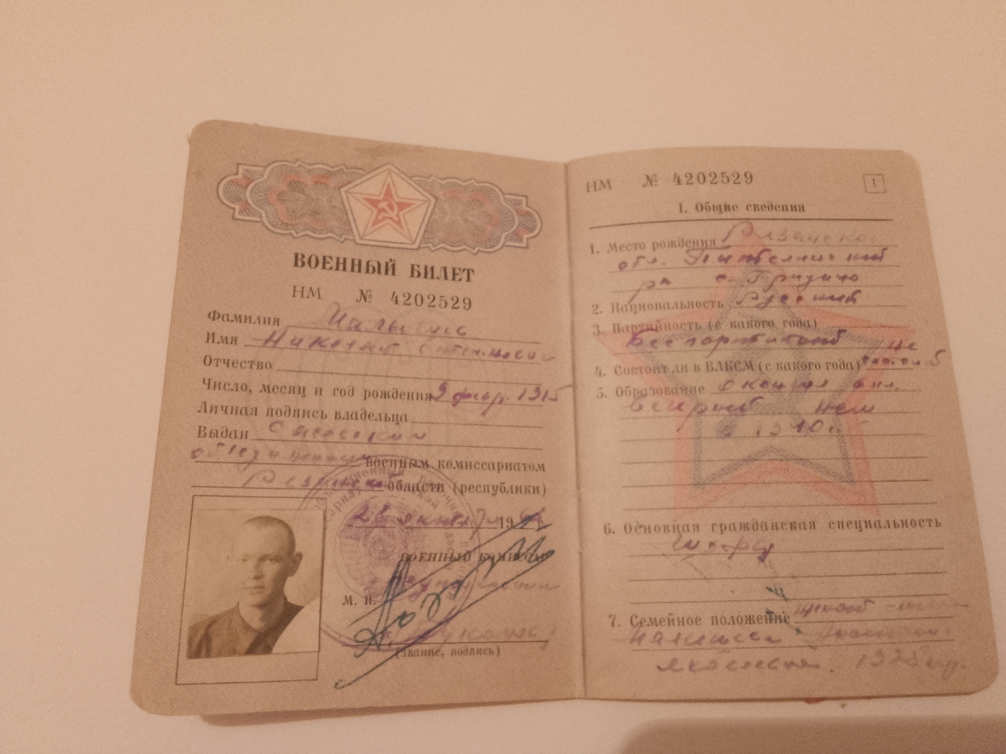 Образование 6 классов, и вечерняя школа. Основная гражданская профессия -шофёр. Женат на Малышевой Анастасии Яковлевне. На военную службу был призван в ВС СССР 16.10.1938 года, проходил службу с 10.1938 г. по 10.1940 5 стр. корпус ; с 10.1940г по 6.1943г. 143 танк. полк; с 6.1943 г. по 8. 1943 г 206 зап. стр. полк; с 8.1943 по 10.1945г. танковое училище Уволен с военной службы 11 октября 1945 г Закончил танковое училище