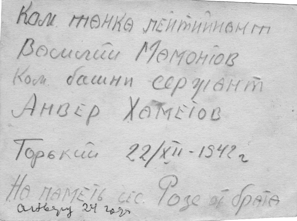 Погиб в бою 14.08.1943, во время очередного штурма г. Дергачи, центра одноименного района Харьковской обл., танк был подбит и сгорел. Из всего экипажа танка уцелел только сержант Хаметов. Его успела вытащить санинструктор Ася из Чистополя (или Елабуги). Городок пытались отбить у противника с февраля - марта 1943 г., но взяли только 21 августа.