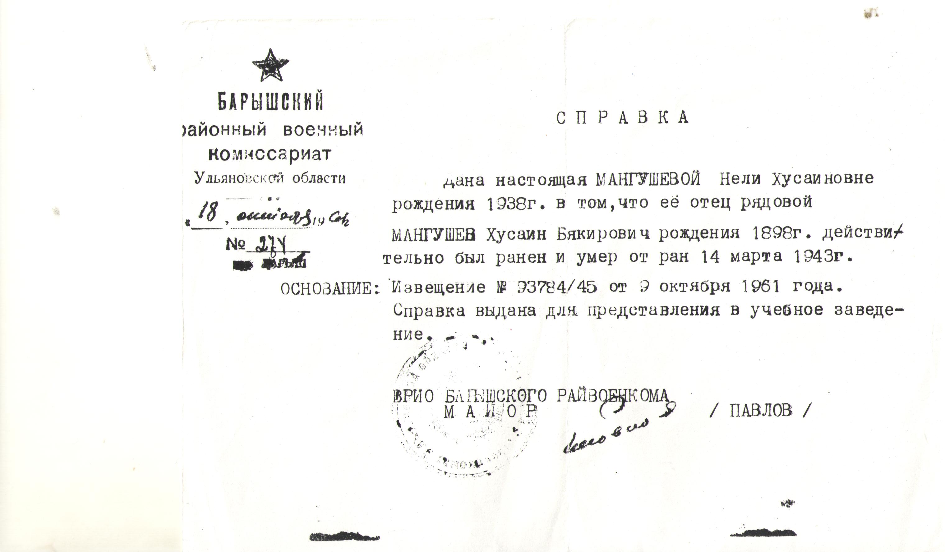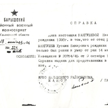 Отца забрали на фронт из поселка Старо Тимошкино Барышского района Ульяновской области (пехота). Вместе с отцом ушли на фронт Мангушев Али Бякирович, брат папы, погиб (к сожалению, не знаю где).