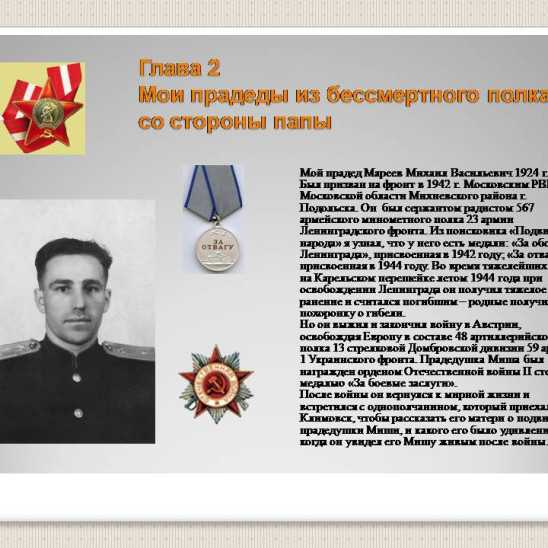 Мой прадед со стороны папы, отец моей бабушки Надежды Михайловны Мироновой - Мареев Михаил Васильевич 1924 г.р.Был призван