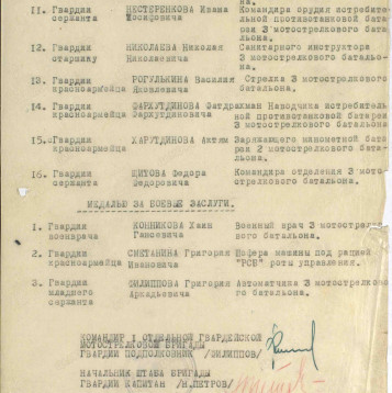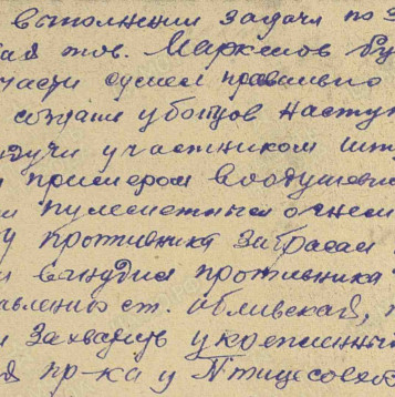Мой прадедушка, Маркелов Николай Афанасьевич, родился 17 мая 1921 года в селе Редькино Калужской области. Его отец Афанасий был сначала крестьянином, потом трудился в колхозе «Путь к коммунизму». Мама, Матрена Анисимовна, занималась домашним хозяйством, работала в колхозе и растила детей. В семье их было четверо – Кирилл, Николай, Вера и Виктор. Мой прадед Коля был вторым ребенком, рос смелым, сильным и очень подвижным, любил играть в футбол и плавать в речушке Медынке. Иногда вместе с друзьями ходил на рыбалку. Прадедушка был очень трудолюбивым, всегда помогал маме по дому и на огороде, присматривал за младшими детьми. Мой дедушка Валера рассказывал, что у его отца были очень сильные руки, он запросто мог подтянуться на одной руке несколько раз. А еще прадедушка был очень любознательным и успел до войны закончить семилетнюю школу. Школа была в пяти километрах от села, и прадедушка Коля каждый день ходил в школу пешком, потому что очень хотел учиться и стать строителем. Он стал выносливым, и это пригодилось ему во время войны. Отца у прадедушки не стало в июне 1940 года, и многие заботы легли на плечи старших детей – Кирилла и Николая. За десять дней до начала Великой Отечественной войны, 12 июня 1941 года, мой прадедушка был призван в ряды Советской армии и стал солдатом. А военную присягу он принимал уже во время войны – 7 ноября 1941 года – в день годовщины Великой Отечественной социалистической революции. Совсем немного он был рядовым 125-го батальона аэродромного обслуживания Западного фронта. Уже в октябре 1941 года он стал командиром отделения. А в конце апреля 1942 года, закончив скоростные курсы, был переведен командиром боевого орудия 1-ой гвардейской отдельной мото-стрелковой бригады Брянского фронта. Немного мой прадедушка был заместителем командира роты по политчасти. С июня 1943 года и до конца войны воевал в составе 1-ой гвардейской отдельной мото-стрелковой бригады 1-го Белорусского фронта под командованием Георгия Константиновича Жукова, был командиром огневого взвода. Вместе со своей частью он дошел до Берлина, был у стен Рейхстага, видел, как над ним взвилось знамя Победы. Мой прадедушка не любил рассказывать о войне. Было очень страшно и трудно всем, было много крови и много потерь. Его младший брат Виктор погиб в 1942 году, освобождая город Гохнов. Мой прадедушка Николай защищал Сталинград, освобождал Варшаву и узников Освенцима. Все долгие годы войны, долгие километры вместе со своим боевым расчетом пешком и ползком, протащив в холод и грязь на руках, а где-то на лошадях, своего верного друга – пушку «сорокопятку» (45-мм противотанковая пушка образца 1937 года – советское полуавтоматические противотанковое орудие калибра 45 миллиметров). Прадедушке повезло – у него было только несколько легких ранений, но осколки от снарядов навсегда остались у него в плече. Совсем немного подлечившись в госпитале, он всегда возвращался в свой полк и снова воевал, освобождая Родину от фашистов. Мой прадедушка Николай настоящий герой. У него много боевых наград: две медали «За отвагу», два ордена «Красной Звезды», орден «Отечественной войны» первой и второй степени, медали «За освобождение Варшавы», «За оборону Сталинграда», «За победу над Германией». Прадедушка вернулся с войны только через год – в 1946 году в звании старшего-лейтенанта. Целый год он 