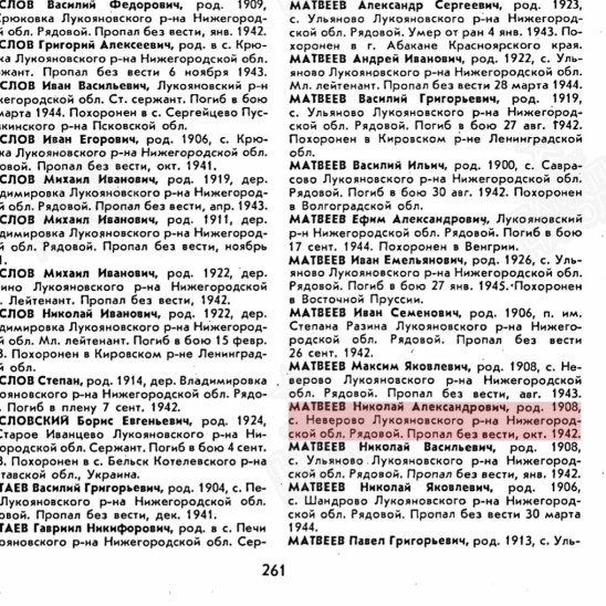 Матвеев Н.А родился в небольшом селе Неверово, Нижегородской (Горьковской) области. У него была жена Матвеева Домна Лукинична и дети Матвеева (Баринова) Таисия Николаевна, Матвеева (Мочалова) Анастасия Николаевна, Матвеев Виктор Николаевич. Николай Александрович был призван 26.06.1941 года. Последнее место службы 179 мед.сан.бат; должность - санитар. Из госпиталя было последнее письмо от 16.06.1942 года. Пропал без вести в октябре 1942 года. Предположительно 179 мед.сан.батальон входил в состав 137 стрелковой дивизии, которая на момент пропажи солдата, 28 апреля 1942 года участвовала в безуспешном штурме Мценска (Орловская область). В течение 1942 года держала оборону в том же районе. Вероятно в Орловской области и пропал без вести Матвеев Н.А.