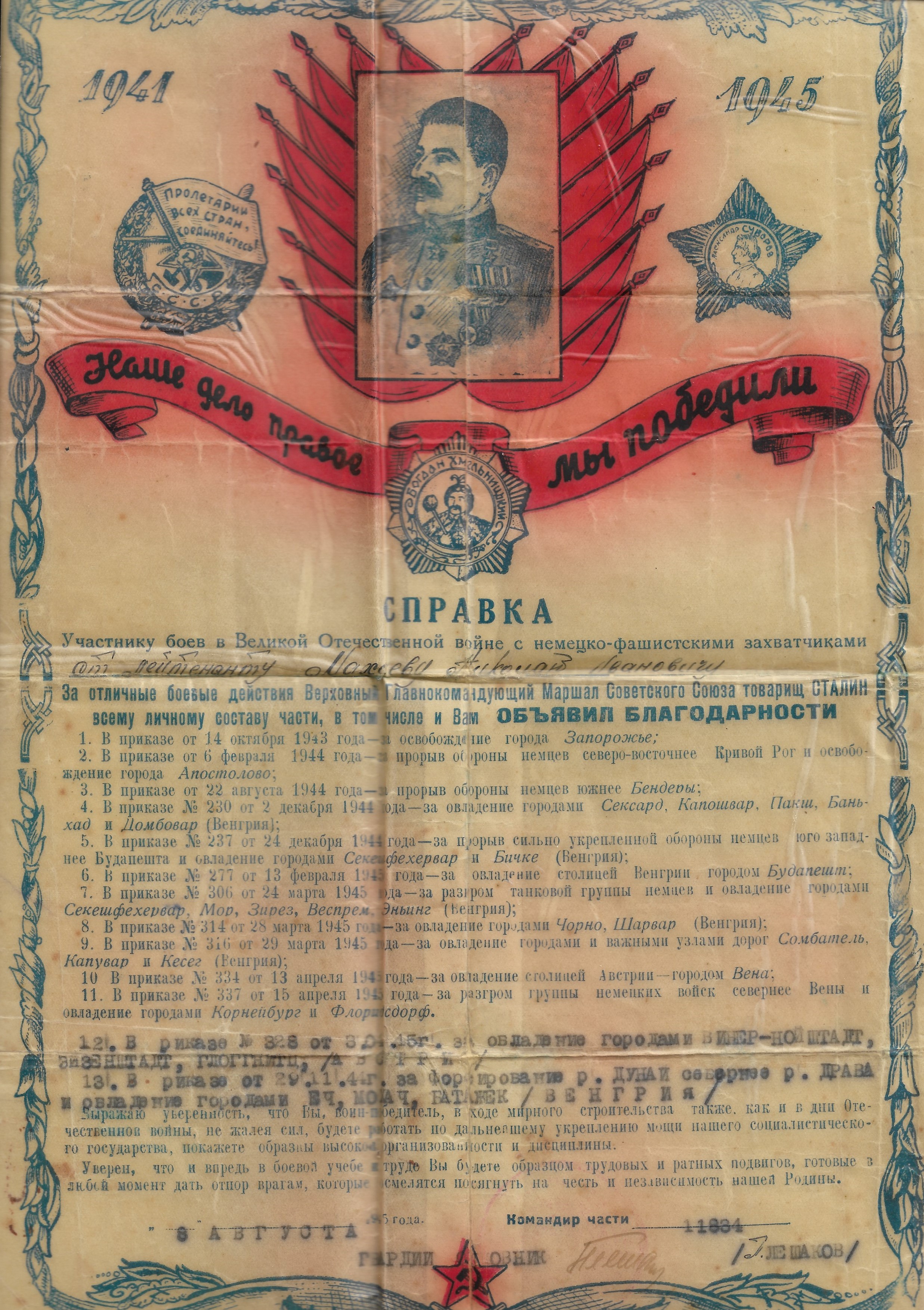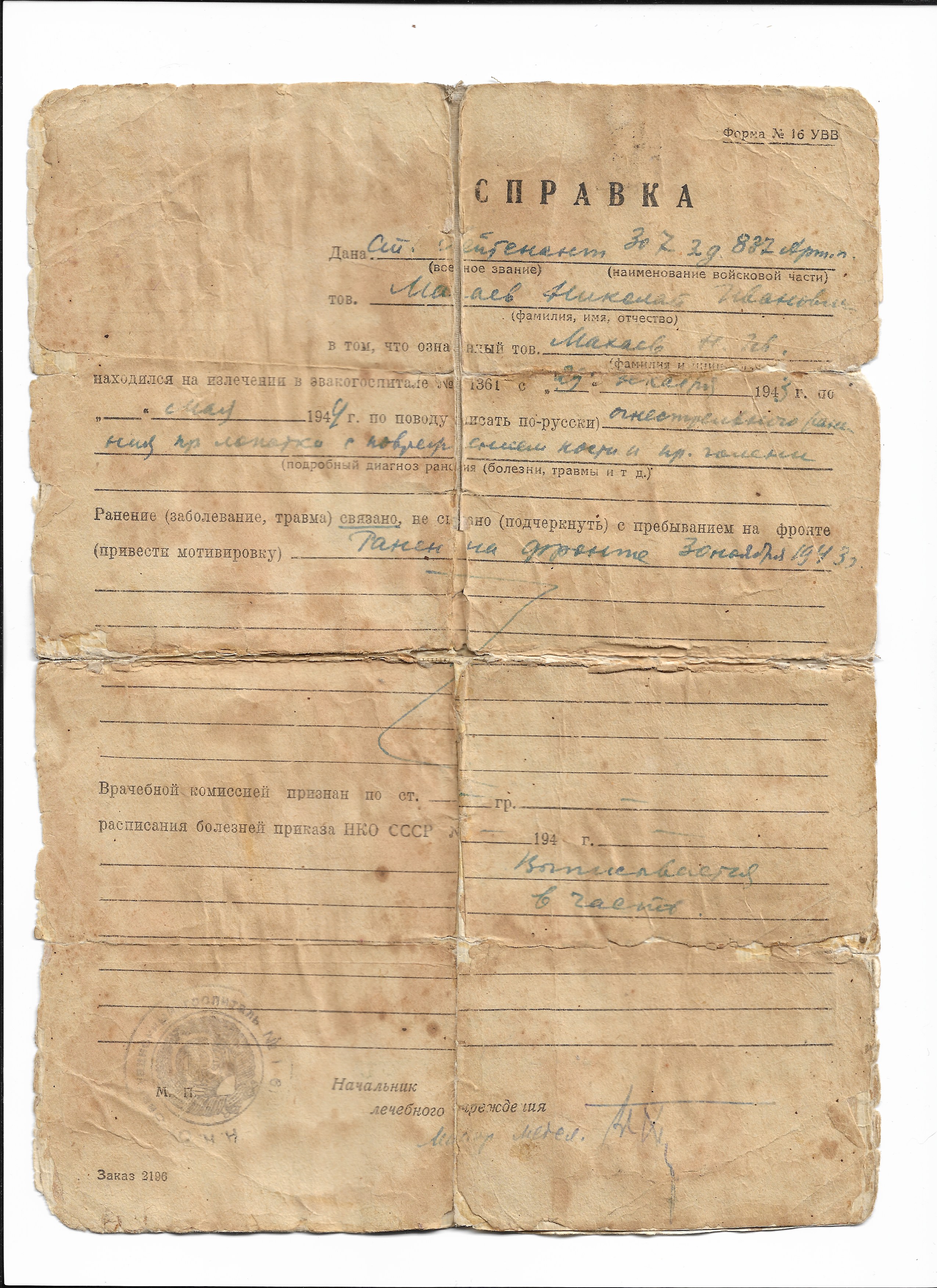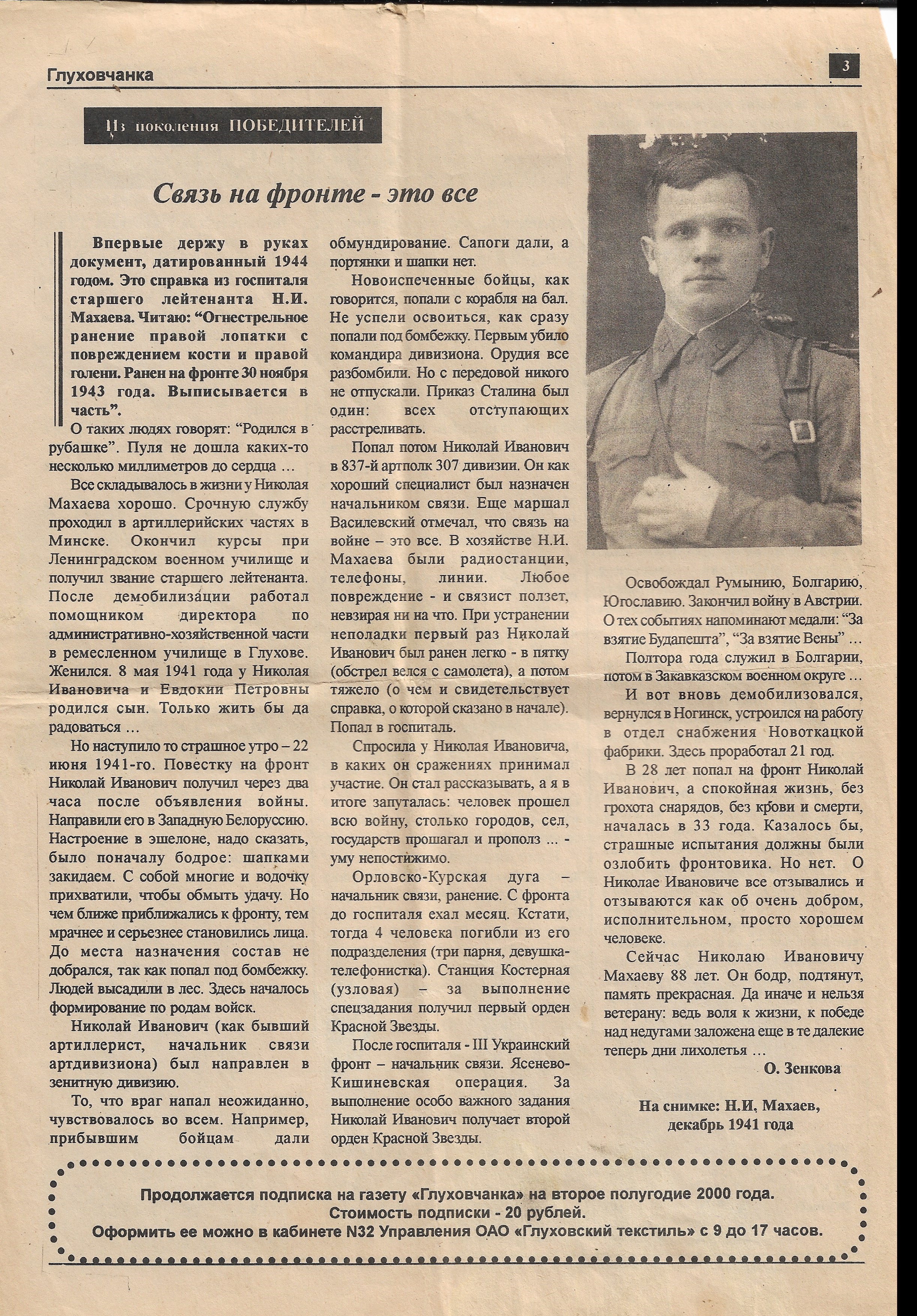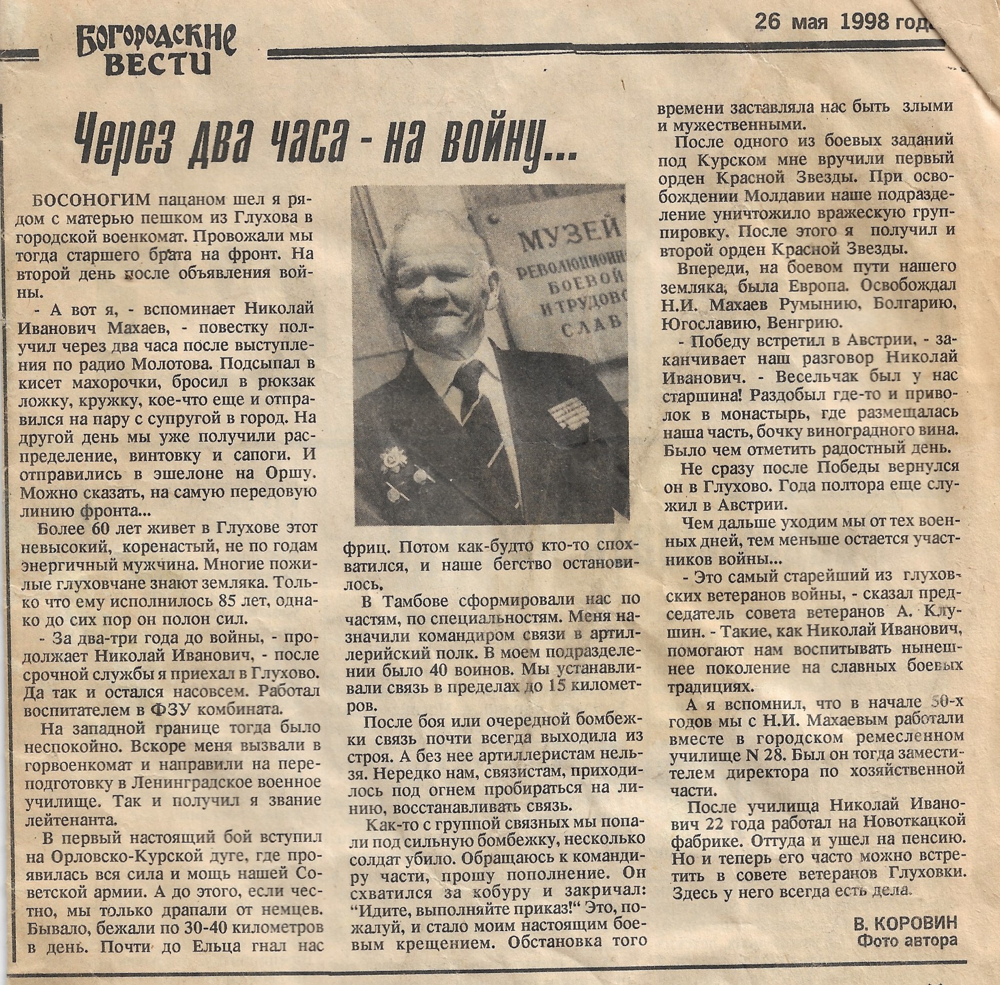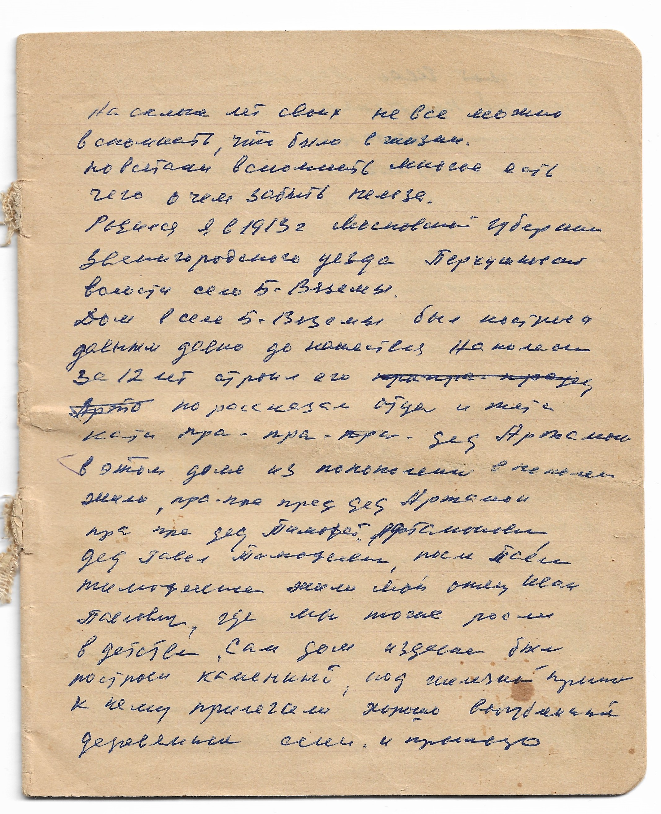 Я, Новикова Анна, в данной работе с огромным желанием хочу рассказать про уникальные вещи, оставленные нам моим дедом, ветераном Великой Отечественной войны, орденоносцем, Махаевым Николаем Ивановичем, которые мы бережно храним и считаем бесценными семейными реликвиями. Среди них почетное место занимает его рукопись, в которой дед, родившийся в начале 20 века в многодетной семье простых крестьян, перечисляет поименно всех своих предков вплоть до 5 поколения! Вот, что он пишет. «На склоне лет своих не всё можно вспомнить, что было в жизни, но всё-таки вспомнить многое есть чего, о чем забыть нельзя. Родился я в 1913 году в Московской губернии Звенигородского уезда Перхушковской волости селе Большие Вяземы. Дом в селе Большие Вяземы был построен давным-давно, до нашествия Наполеона за 12 лет. Строил его, по рассказам отца и тети Кати пра-прапрадед Артамон. В этом доме из поколения в поколение жили пра-пра-прадед Артамон, пра-пра дед Михаил Артамонович, прадед Тимофей Михайлович, дед Павел Тимофеевич, после Павла Тимофеевича жили мой отец Иван Павлович, где мы тоже росли в детстве. Сам дом издавна был построен каменный под железной крышей, к нему прилегали хорошо вырубленные сени и крыльцо». Найденные нами в этом году в Московском архиве метрические записи подтверждают слова деда. Его пращур Артамон Алексеевич действительно жил на рубеже 18-19 веков, был он 1769 года рождения. «Отец мой Иван Павлович, потомок крестьянина, имел по тому времени начальное образование сельской школы, окончив её с отличием, за что имел свидетельство отличий и похвальный лист. Вся жизнь его была заполнена нелегким крестьянским трудом, который начинался с рассвета и длился до поздней ночи во все остальные дни, кроме больших праздников: Пасхи, Рождества и Николы. Тяжелая нужда… С поздней осени и всю зиму отец и мать занимались корзиноплетением, так как в то время почти все жители Звенигородского уезда занимались этим кустарным ремеслом. Делали себе погремушки, гарнитуры, горшки для цветов, плетеные кресла, стулья, всё это делалось с большим искусством и красотой. Готовые изделия частники отвозили в Москву и продавали на рынках Сухаревки, Тишинки, Цветном бульваре и Тверской. На вырученные деньги покупали продукты, одежду и другие расходы. Ремесло тоже давалось нелегко, за этим изделием просиживали с раннего утра до поздней ночи. К этому ремеслу привлекали меня и брата Павла. Мать Мария Михайловна была физически очень сильным человеком, выполняла всю тяжелую физическую нелегкую мужскую работу: косила, пахала, пилила дрова, она была неграмотной, но боевой женщиной, немного даже было у нее озорства». В одной из тех самых упомянутых дедом корзин, сплетенной в тяжелые годы лишений детскими руками, он хранил свои фронтовые награды, трофеи, документы, метрики и старые фотографии, перебирая и рассматривая которые можно прикоснуться к истории рода нашей семьи и как на машине времени перенестись в далекие огненные военные годы... Отучившись в начальной школе, дед получил профессию столяра. В 1935 году был призван на два года в ряды Красной армии, службу проходил в артиллерийских частях в Минске. «За два-три года до войны, после срочной службы я приехал в Глухово. Да так и остался насовсем. Работал воспитателем в ФЗУ комбината. На западной границе тогда было неспокойно. Вскоре ме