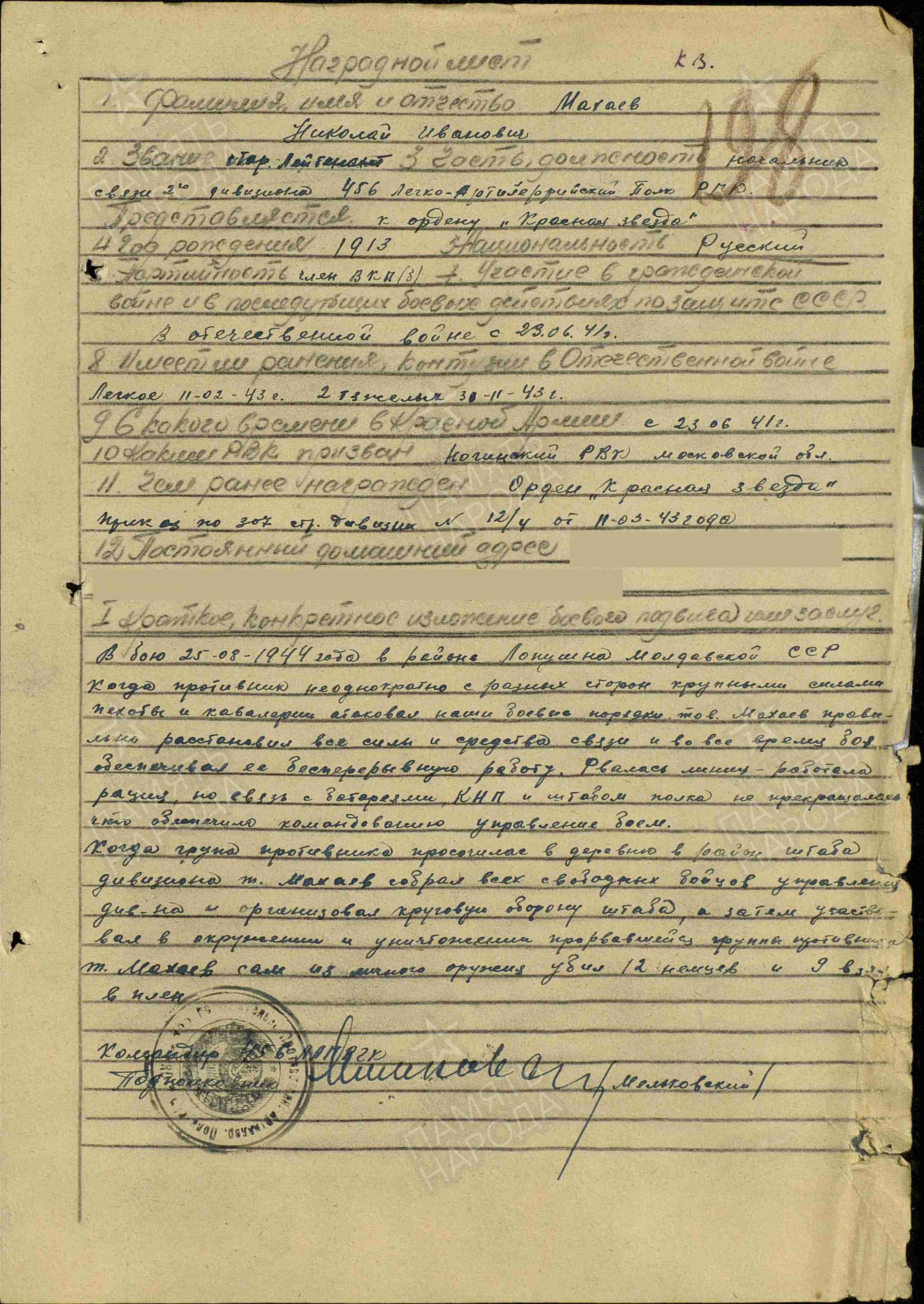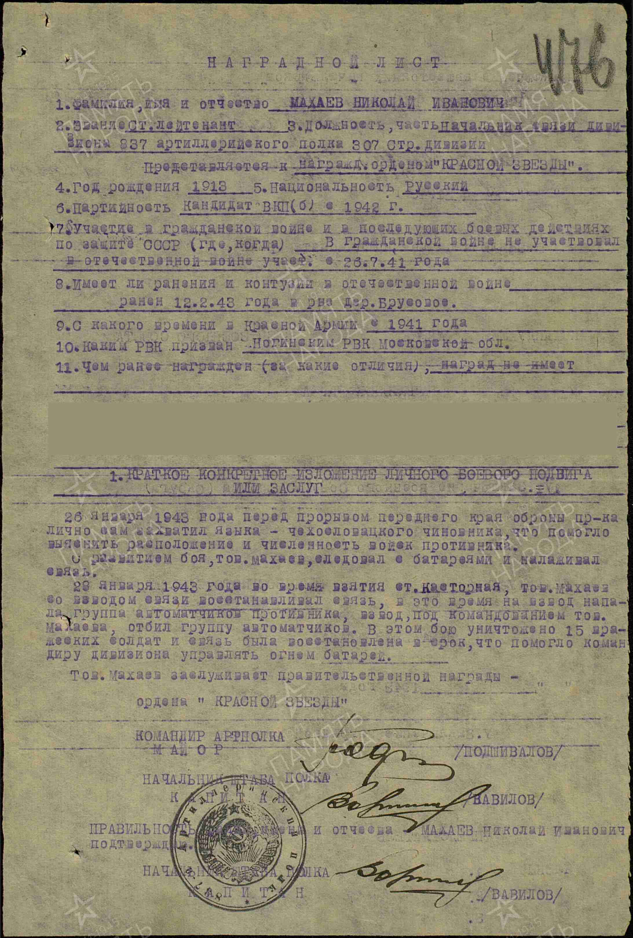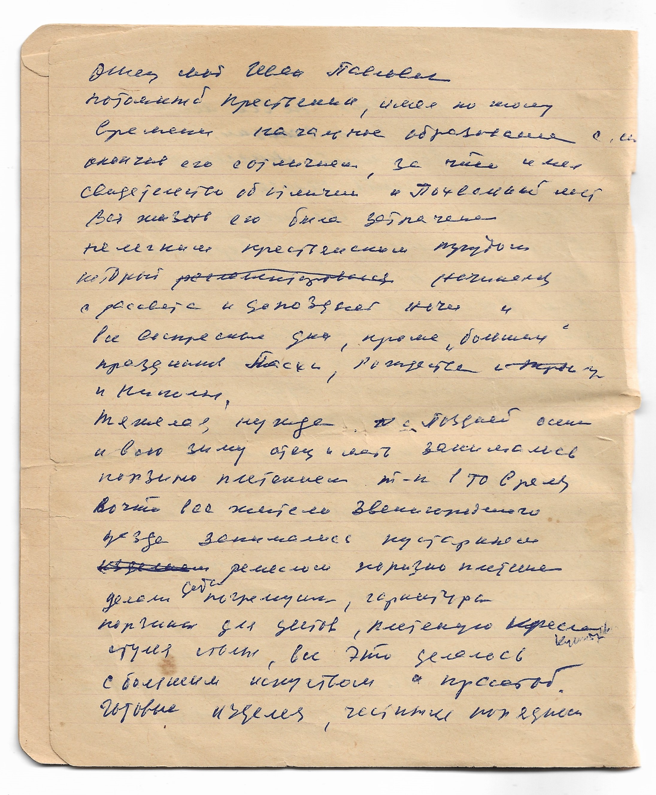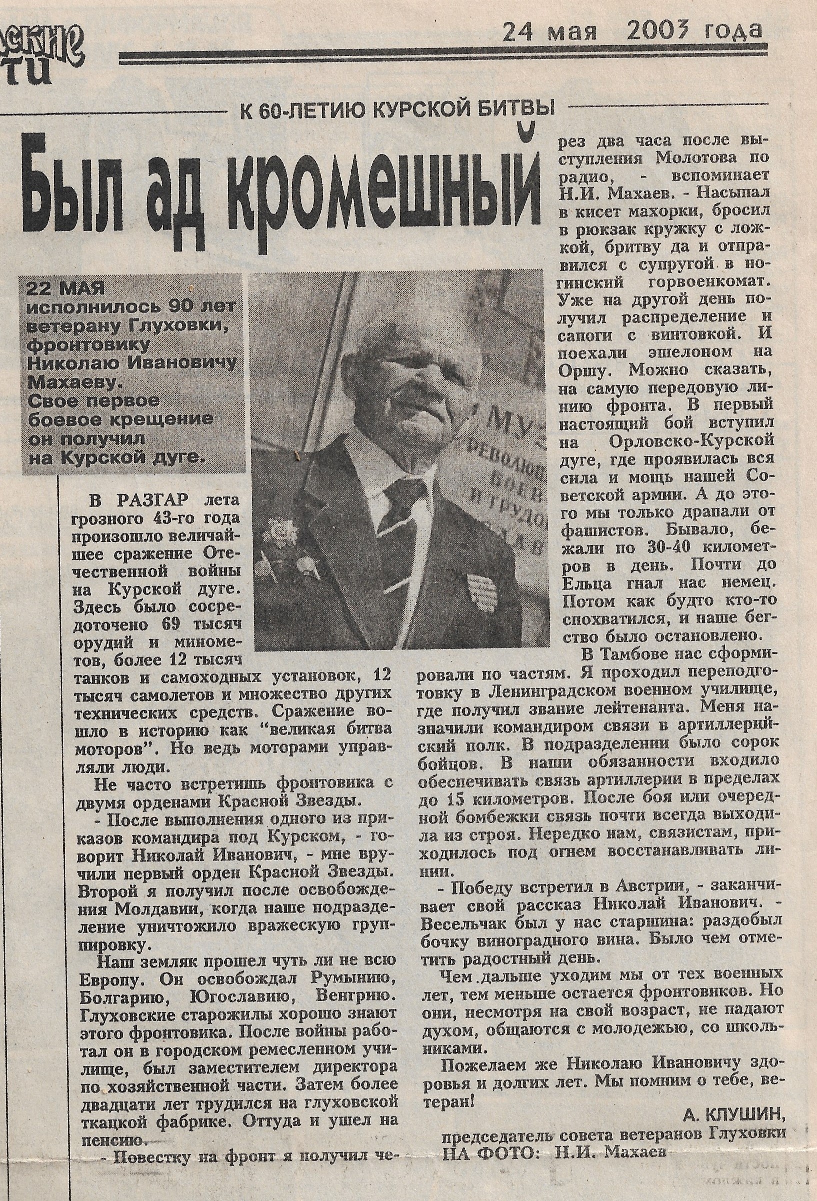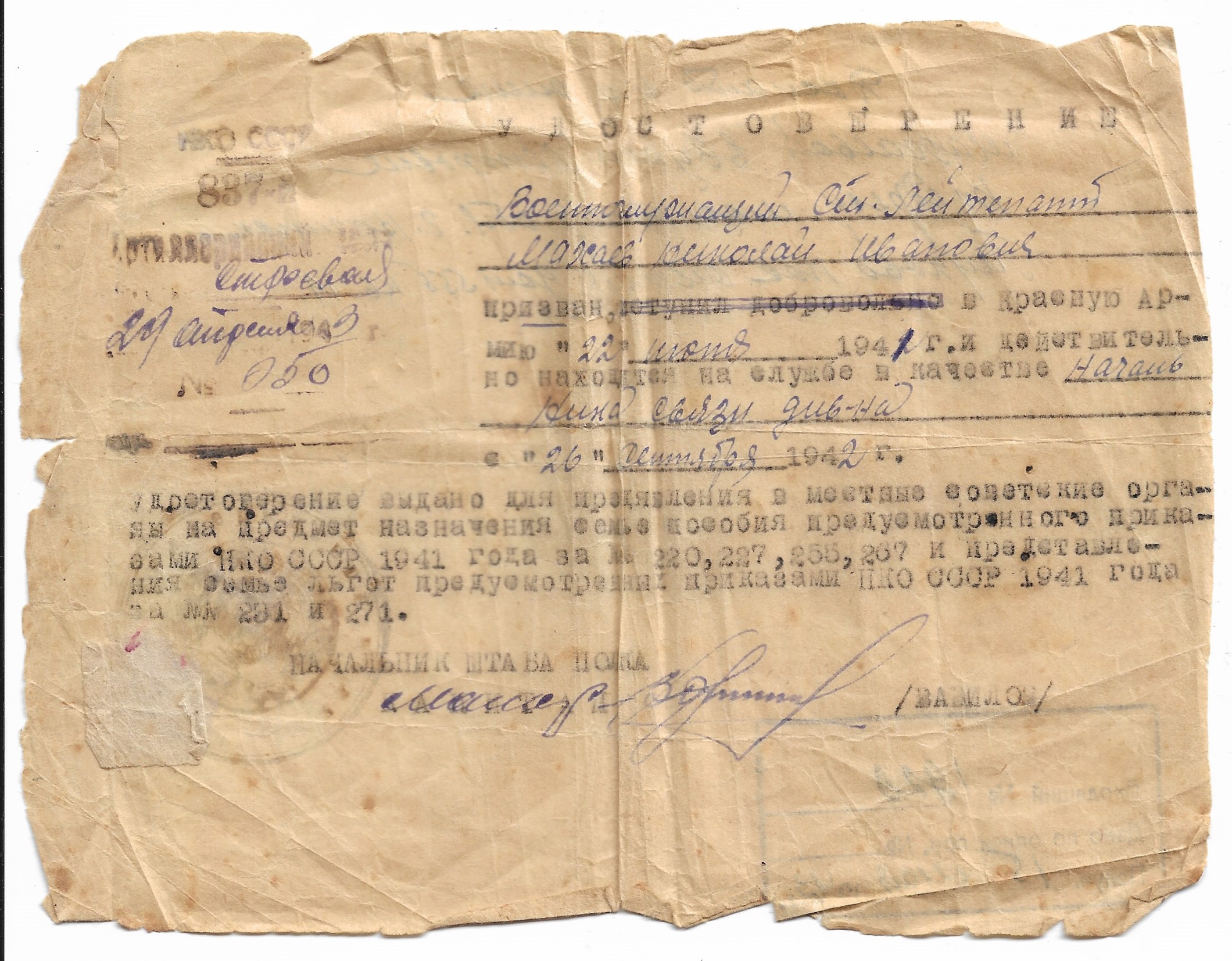 Я, Новикова Анна, в данной работе с огромным желанием хочу рассказать про уникальные вещи, оставленные нам моим дедом, ветераном Великой Отечественной войны, орденоносцем, Махаевым Николаем Ивановичем, которые мы бережно храним и считаем бесценными семейными реликвиями. Среди них почетное место занимает его рукопись, в которой дед, родившийся в начале 20 века в многодетной семье простых крестьян, перечисляет поименно всех своих предков вплоть до 5 поколения! Вот, что он пишет. «На склоне лет своих не всё можно вспомнить, что было в жизни, но всё-таки вспомнить многое есть чего, о чем забыть нельзя. Родился я в 1913 году в Московской губернии Звенигородского уезда Перхушковской волости селе Большие Вяземы. Дом в селе Большие Вяземы был построен давным-давно, до нашествия Наполеона за 12 лет. Строил его, по рассказам отца и тети Кати пра-прапрадед Артамон. В этом доме из поколения в поколение жили пра-пра-прадед Артамон, пра-пра дед Михаил Артамонович, прадед Тимофей Михайлович, дед Павел Тимофеевич, после Павла Тимофеевича жили мой отец Иван Павлович, где мы тоже росли в детстве. Сам дом издавна был построен каменный под железной крышей, к нему прилегали хорошо вырубленные сени и крыльцо». Найденные нами в этом году в Московском архиве метрические записи подтверждают слова деда. Его пращур Артамон Алексеевич действительно жил на рубеже 18-19 веков, был он 1769 года рождения. «Отец мой Иван Павлович, потомок крестьянина, имел по тому времени начальное образование сельской школы, окончив её с отличием, за что имел свидетельство отличий и похвальный лист. Вся жизнь его была заполнена нелегким крестьянским трудом, который начинался с рассвета и длился до поздней ночи во все остальные дни, кроме больших праздников: Пасхи, Рождества и Николы. Тяжелая нужда… С поздней осени и всю зиму отец и мать занимались корзиноплетением, так как в то время почти все жители Звенигородского уезда занимались этим кустарным ремеслом. Делали себе погремушки, гарнитуры, горшки для цветов, плетеные кресла, стулья, всё это делалось с большим искусством и красотой. Готовые изделия частники отвозили в Москву и продавали на рынках Сухаревки, Тишинки, Цветном бульваре и Тверской. На вырученные деньги покупали продукты, одежду и другие расходы. Ремесло тоже давалось нелегко, за этим изделием просиживали с раннего утра до поздней ночи. К этому ремеслу привлекали меня и брата Павла. Мать Мария Михайловна была физически очень сильным человеком, выполняла всю тяжелую физическую нелегкую мужскую работу: косила, пахала, пилила дрова, она была неграмотной, но боевой женщиной, немного даже было у нее озорства». В одной из тех самых упомянутых дедом корзин, сплетенной в тяжелые годы лишений детскими руками, он хранил свои фронтовые награды, трофеи, документы, метрики и старые фотографии, перебирая и рассматривая которые можно прикоснуться к истории рода нашей семьи и как на машине времени перенестись в далекие огненные военные годы... Отучившись в начальной школе, дед получил профессию столяра. В 1935 году был призван на два года в ряды Красной армии, службу проходил в артиллерийских частях в Минске. «За два-три года до войны, после срочной службы я приехал в Глухово. Да так и остался насовсем. Работал воспитателем в ФЗУ комбината. На западной границе тогда было неспокойно. Вскоре ме