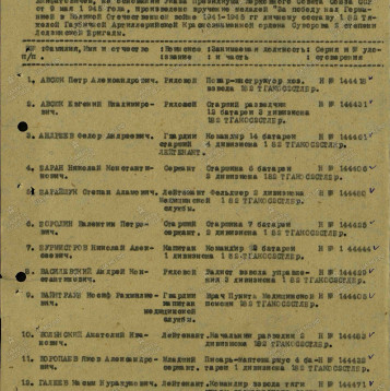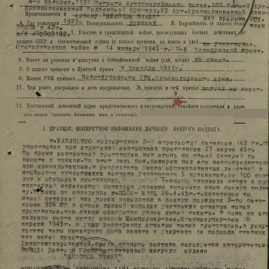 Из архивных документов: боевой подвиг совершил 27.03.45г. на территории Польши в районе Ownice и 26.04.45г. в Германии неподалеку от Хазенфельде.Краткое изложение личного боевого подвига можно прочитать в наградном листе (в фотоальбоме)от 7 мая 1945г.