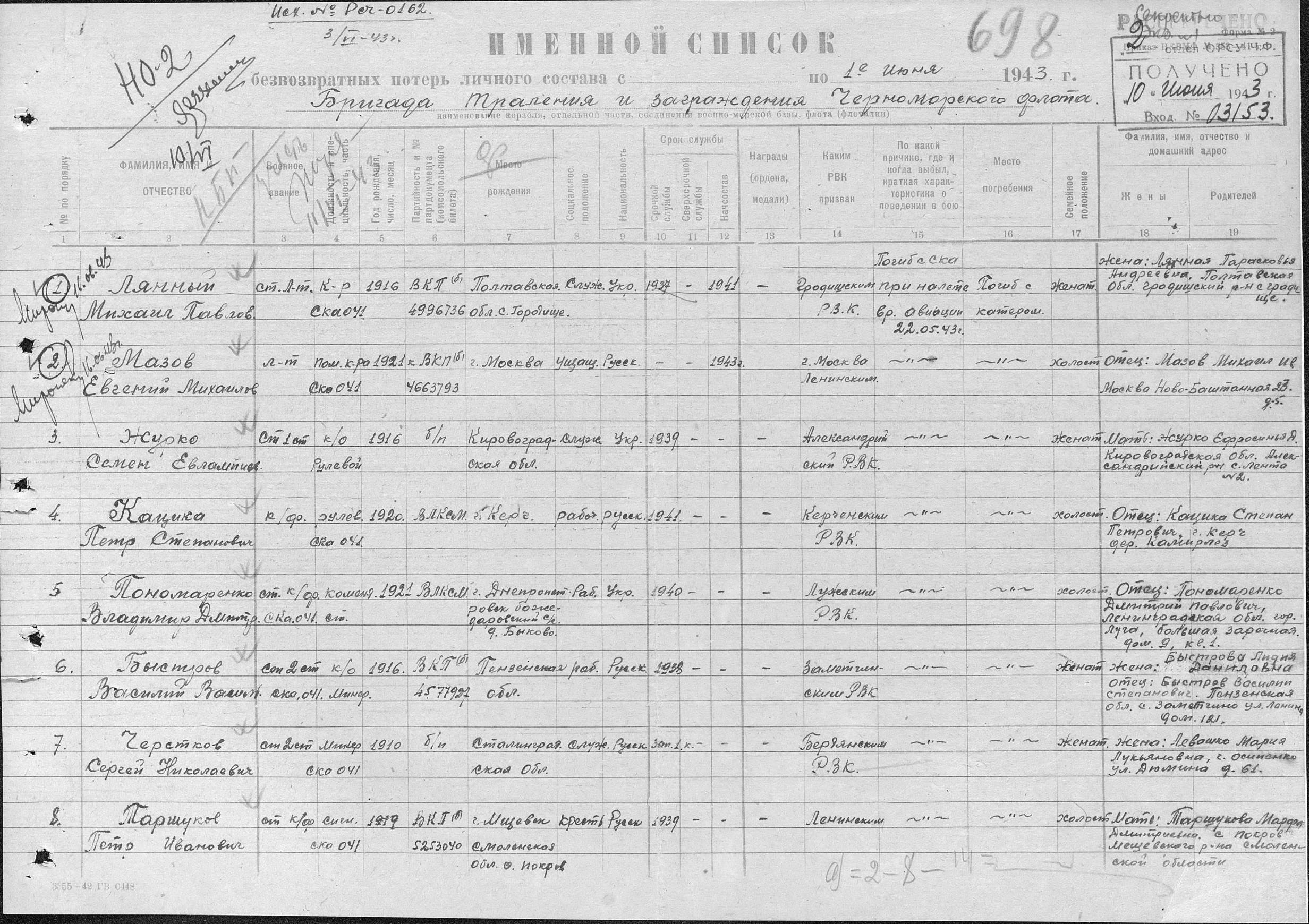 22 мая 1943 года. Служил на сторожевом катере "Морской охотник"