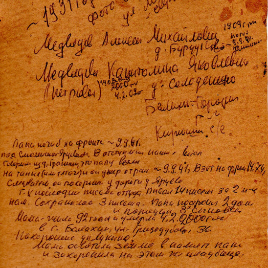 P.s. К сожалению, государство никак не оценило отданную жизнь моего дедушки за Родину, ни наград, ничего, а только признание пропавшим без вести спустя около 10 лет после гибели (есть документ), а также родных слезы и печаль. Неправильно это, неправильно.