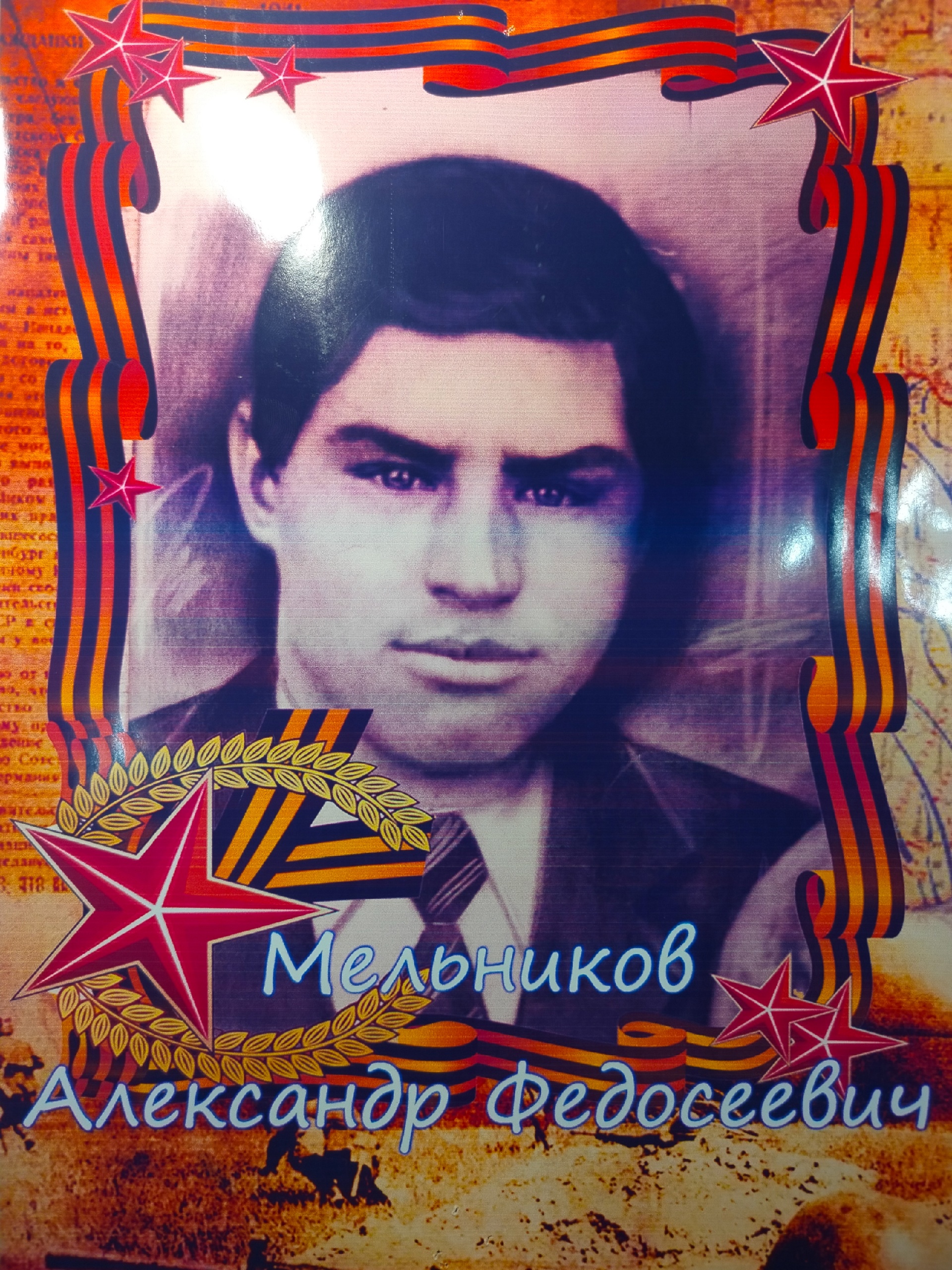 Мельников Александр Федосеевич родился в 1918 году в деревне Немировка Хуторского с/с Лопатинского района Курганской области. Был призван на службу в армию в 1938 году Лебяжьевским РВК Курганской области. Имел воинское звание "рядовой". После службы женился. Жена - Мельникова Феоктиста Александровна. В браке родились дети - дочь Мельникова Валентина Александровна (д/р 1938г) и сын Мельников Иван Александрович (д/р 06.06.1939 г). Александр Федосеевич был призван на фронт в 1941 году. Письменная связь с ним прекратилась с 15 августа 1942 года. Воинский адрес по последнему письму: полевая почтовая станция №0301, военная часть № 4456/4.