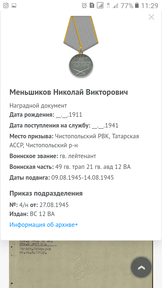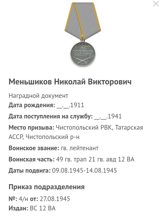 Боевой путь ветерана Мой дедушка, Меньшиков Николай Викторович, был призван 12 августа 1941 года. Он летал к партизанам в отряд Медведева, доставляя провизию, боеприпасы, почту и газеты, осуществляя вывоз в тыл раненых. Так же он участвовал в Хингано-Мукденской наступательной операции, за что был награждён Орденом Красной звезды, Медалью "За победу над Японией", Медалью "За победу над Германией в Великой Отечественной войне 1941-1945 гг". Завершил боевой путь в Харбине 03 июля 1946 года.