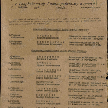 Прошёл Финскую сабельником кавалеристом до звания Ефрейтора, и не возвращаясь домой в Смоленскую деревушку, работал в Московской области на Лианозовском заводе, там и призывался, дошёл до Белоруссии с подвигами и боями и в 1944 в группе разведки при предварительной зачистки, разминирования, и устранения засад, препятствий для подготовки наступления освободительной операции Багратион погиб проявив мужество попав в засаду врага, подробности в документах донесения, свидетельств товарищей наткнулись при прочёсывании села с товарищем на группу фрицев затаившийся в домах села, и из автомата уничтожил до 10 фашистов и 3 офицеров, пока не закончились патроны, потом пошёл в рукопашную, где прикладом уничтожил ещё одного фашиста, далее его смертельно ранили выстрелом. Прибывший взвод подоспев взял ещё пять человек в плен. Награждён ЗА МУЖЕСТВО и первой степени посмертно орденом отечественной войны.