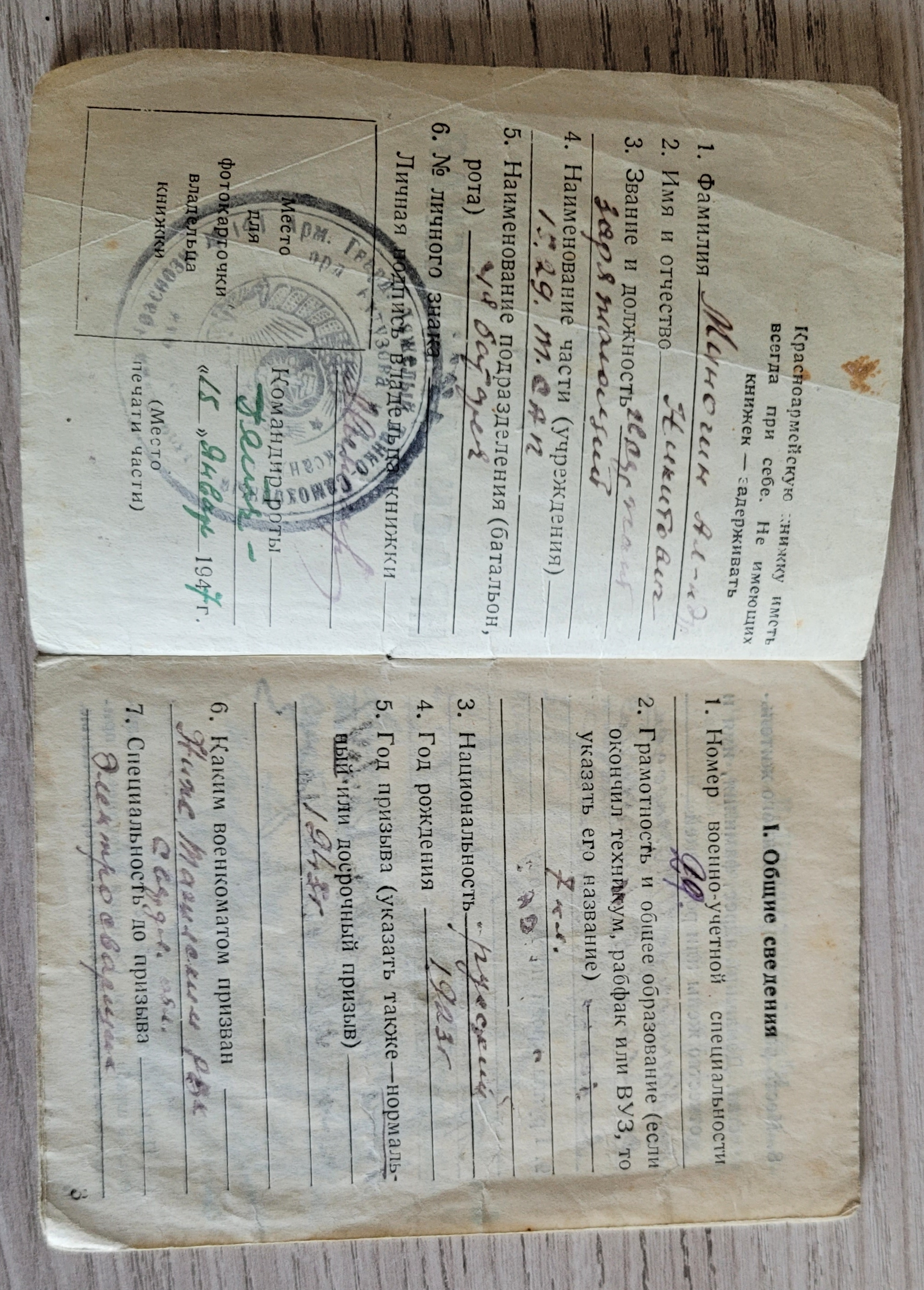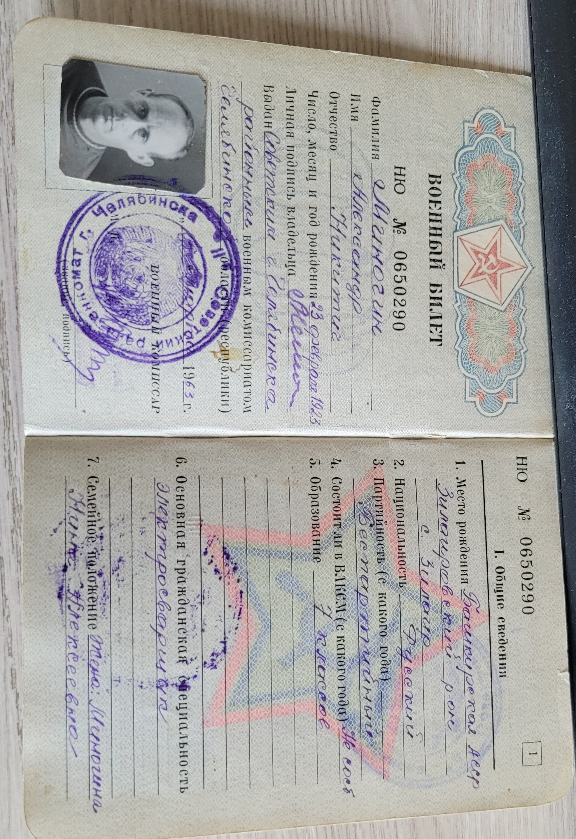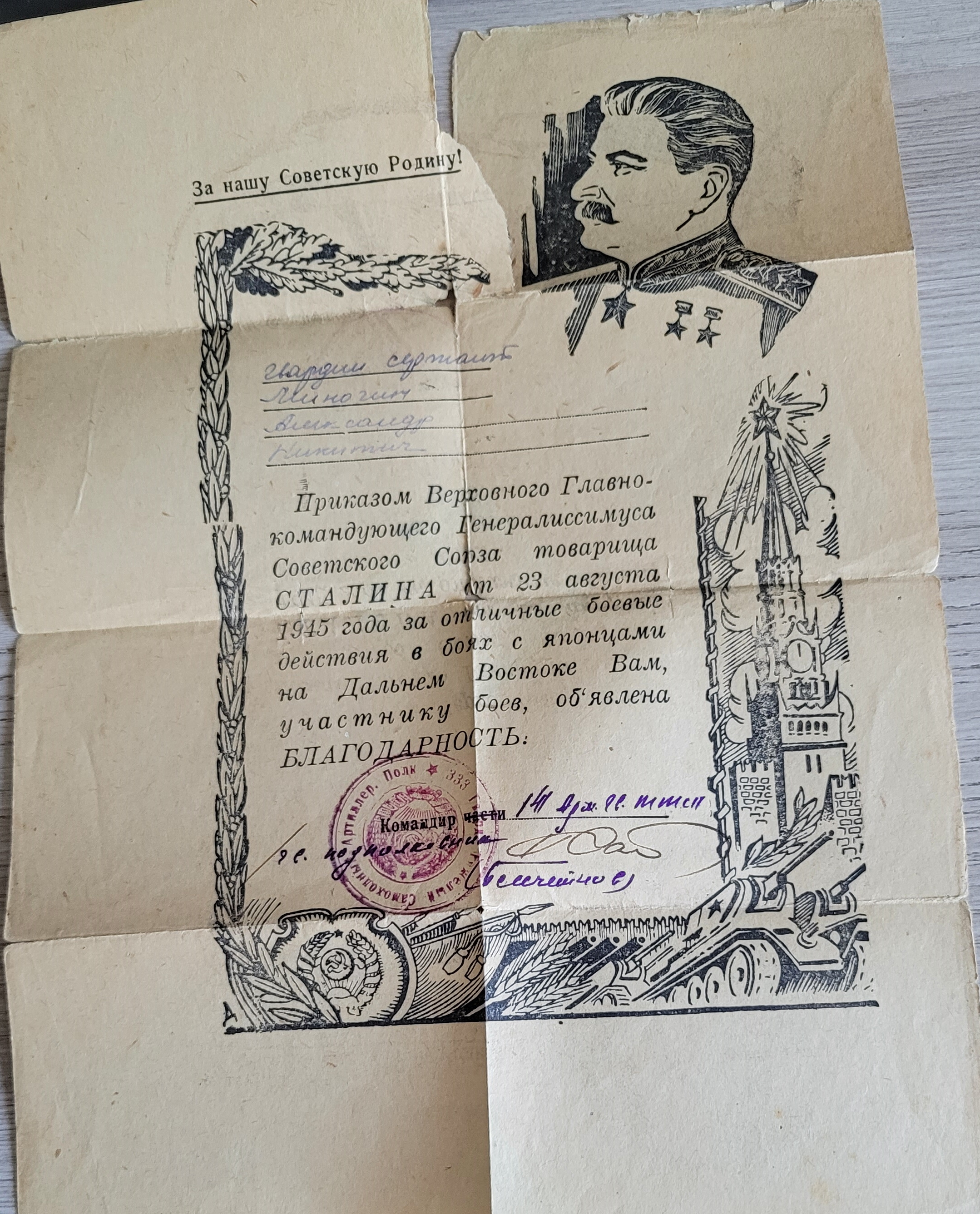 Русский. Образование 7 кл. Гражданская профессия до призыва : электросварщик. В январе 1943 Нижне-Тагильским военкоматом (Свердловская область) призван на военную службу. С января 1943 по март 1943 - курсант полковой школы. Вступил в ряды ВЛКСМ. Военно-учетная специальность: экипажи средних самоходных арт установок. Наводчик. В марте 1943 г. направлен в 1529 тяжелый самоходный арт. полк. Должность: заряжающий. С 17 апреля 1943 по 9 мая 1945 г. принимал участие в Великой Отечественной войне. С 8 августа 1945 г. по 3 сентября 1945 г. в войне с Японией в составе 1529 артполка заряжающим. Награжден Орденом Красная Звезда и медалями "За боевые заслуги", "За победу над Германией", "За победу над Японией". Имеет Благодарности от Верховного Главнокомандующего т. Сталина за взятие Витебска, за освобождение Полоцка, за отличные боевые действия в боях с японцами на Дальнем Востоке. 4 марта 1947 г. демобилизован. С 1951 г. работал в железнодорожном локомотивном депо Челябинска электросварщиком (6-й разряд). Учился в техникуме. Неоднократно награжден званием "Победитель социалистического соревнования". Занимался спортом. Второй разряд по футболу, волейболу и бегу. Председатель цехового комитета. Жена: Миногина Нина Алексеевна. Сын: Миногин Игорь Александрович.