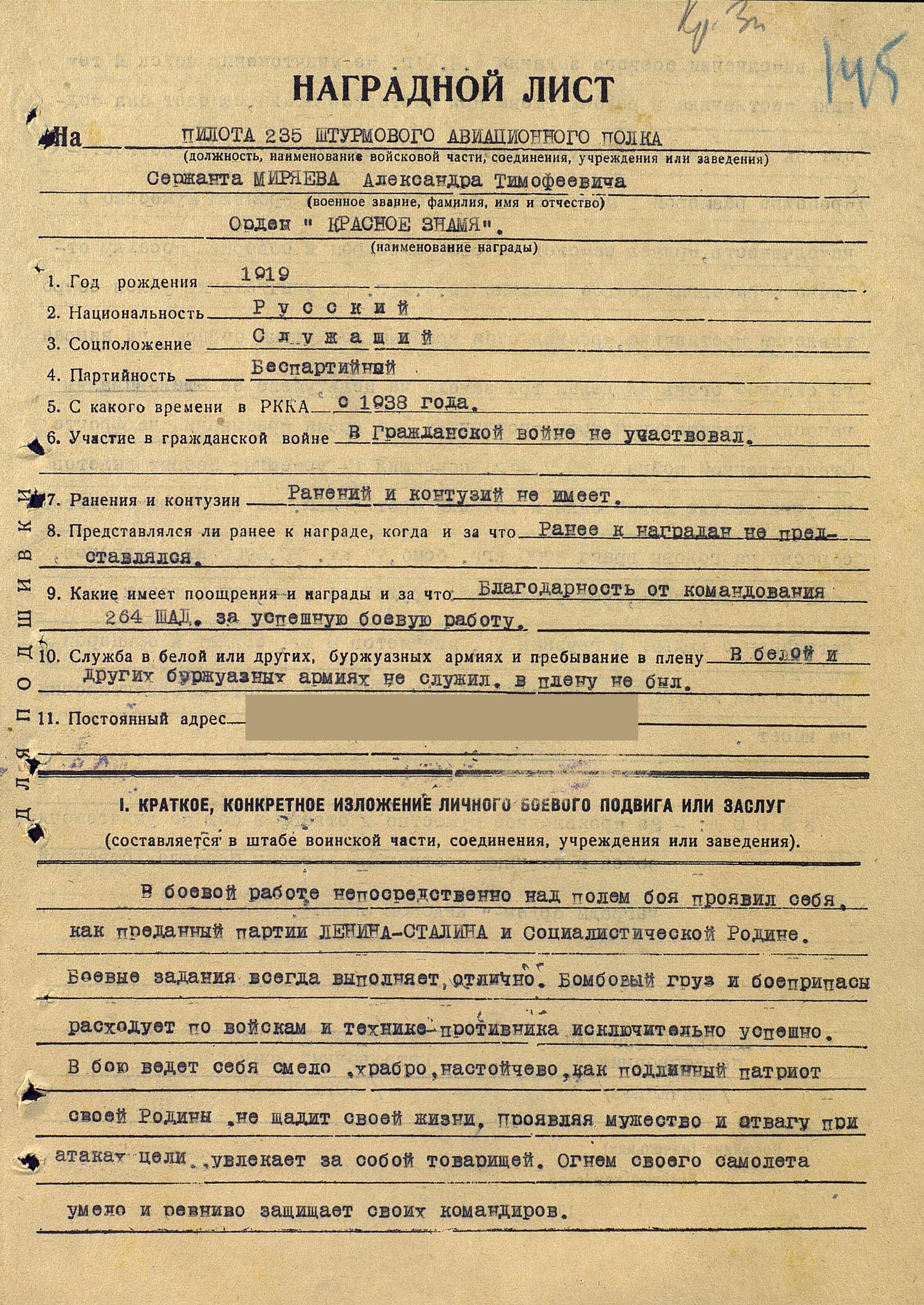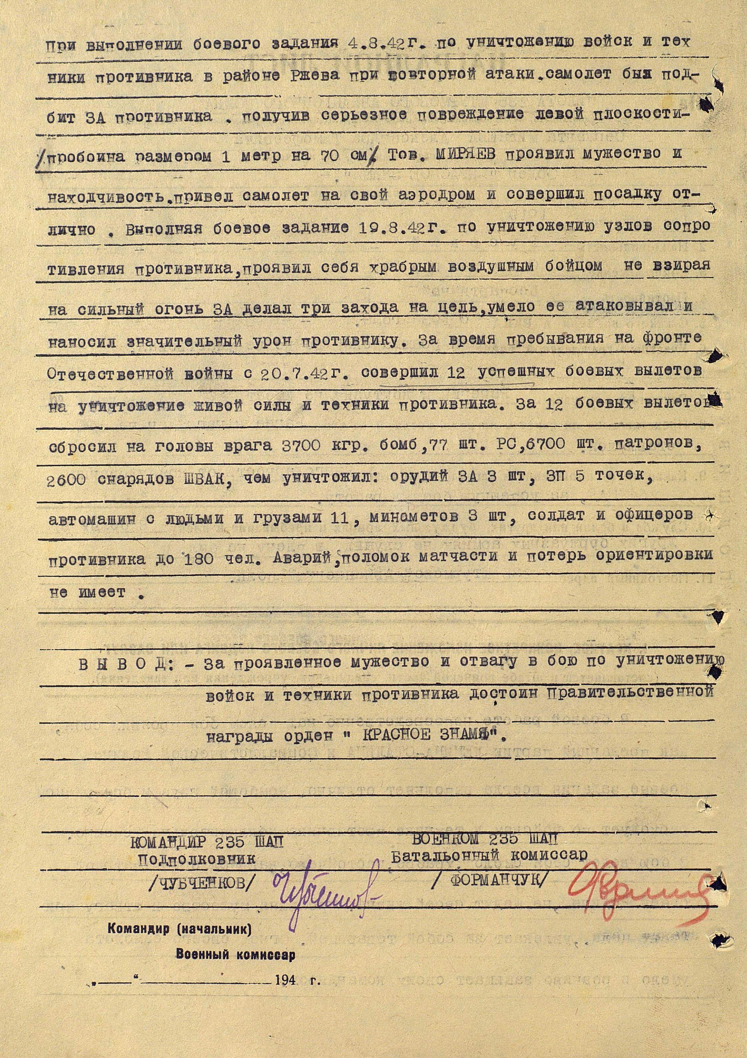 Пилот 235 штурмового авиаполка; не вернулся с боевого задания на самолете ИЛ-2 из района Редькино Ржевского района.