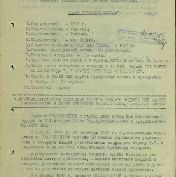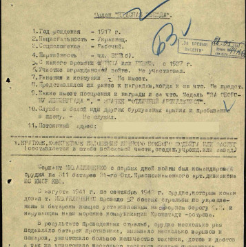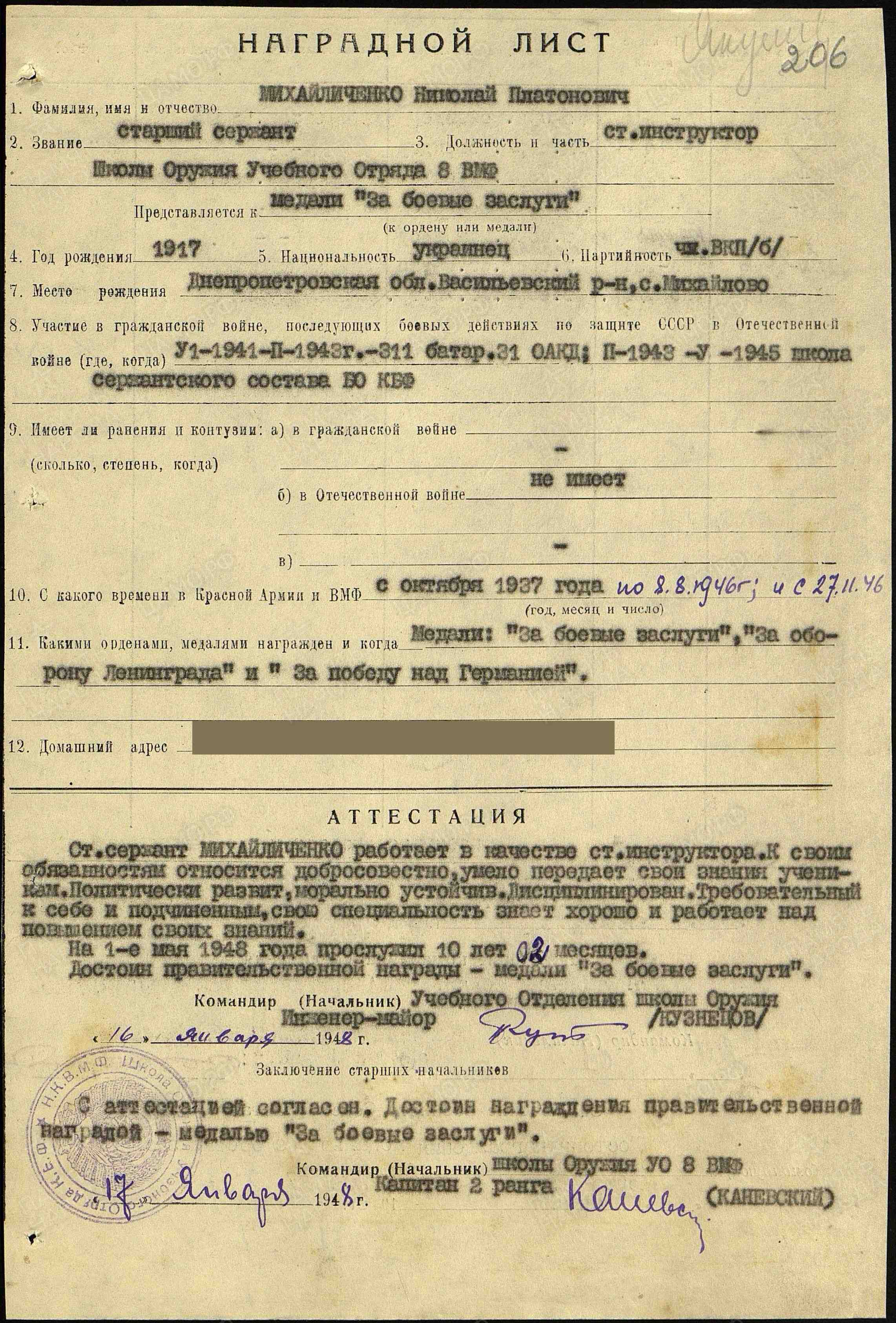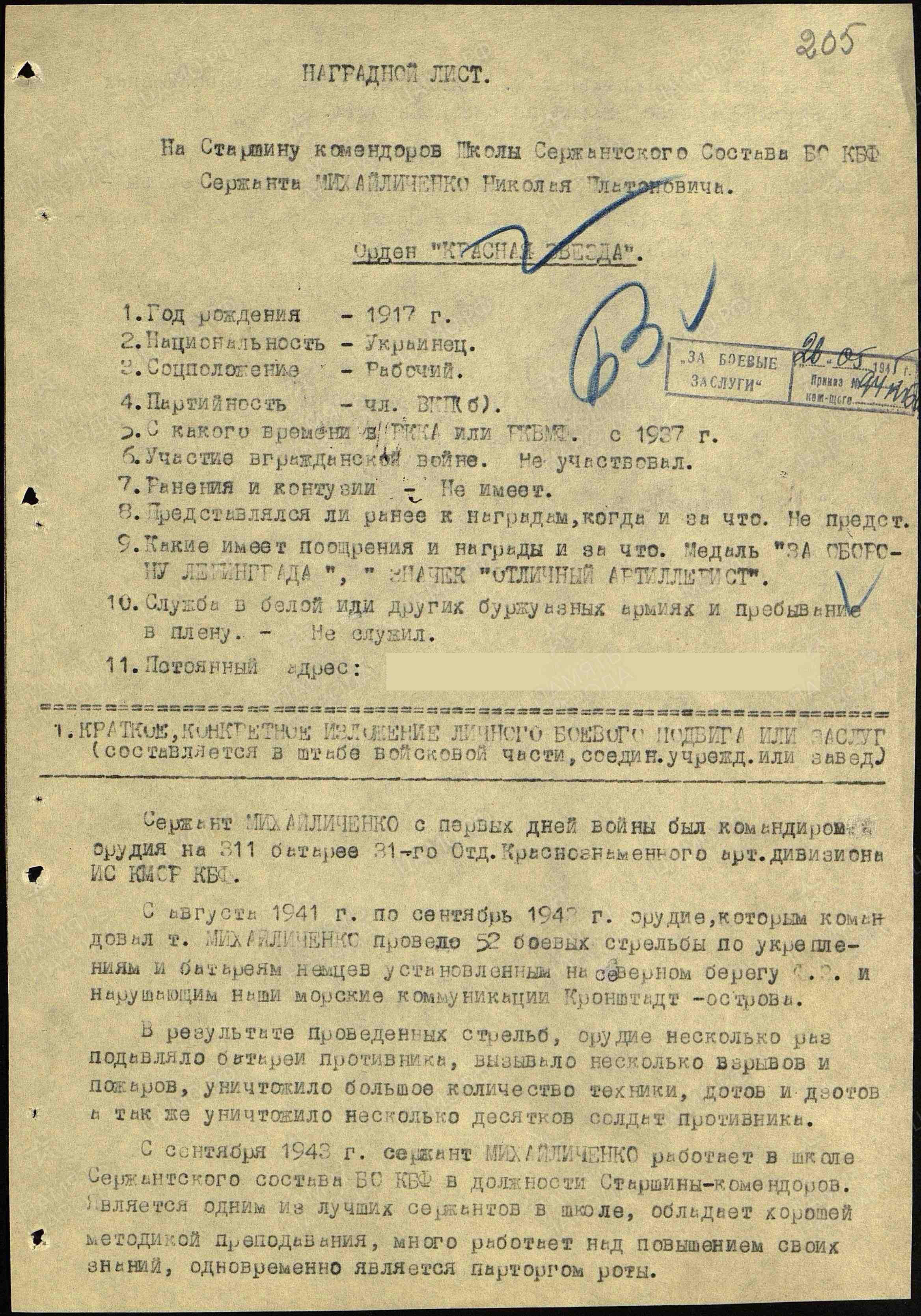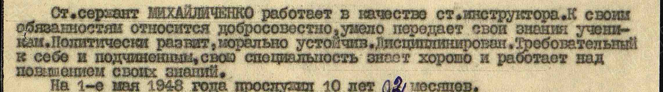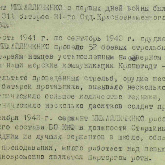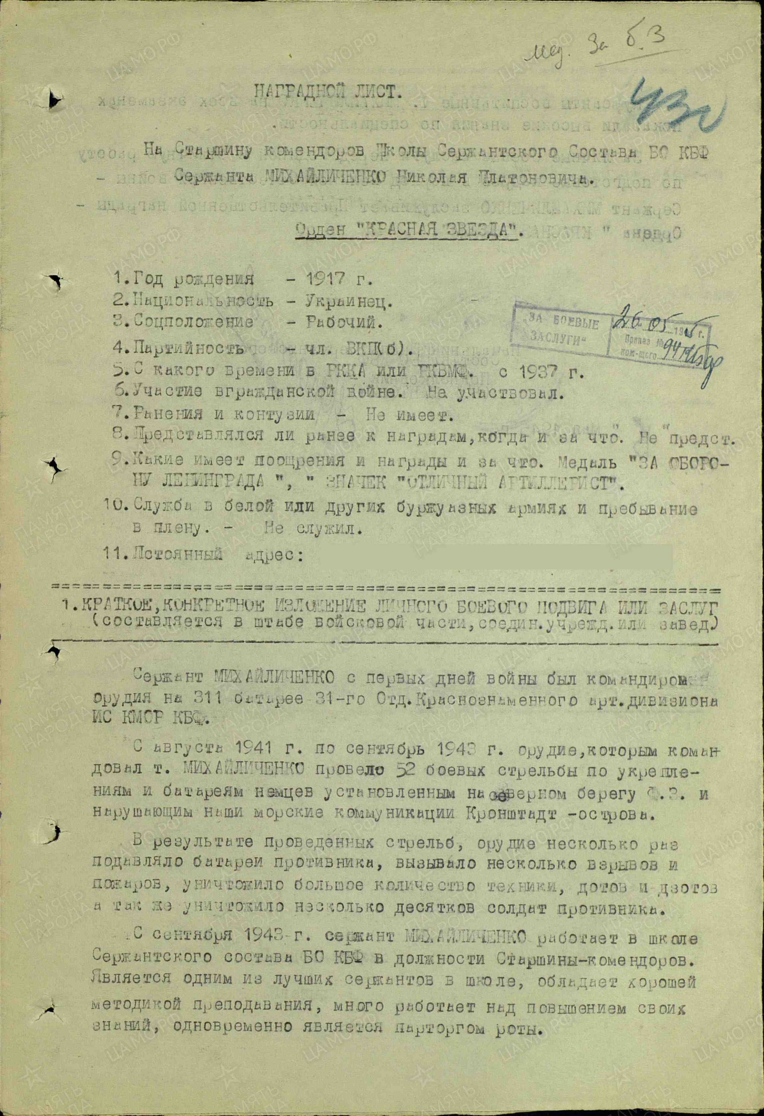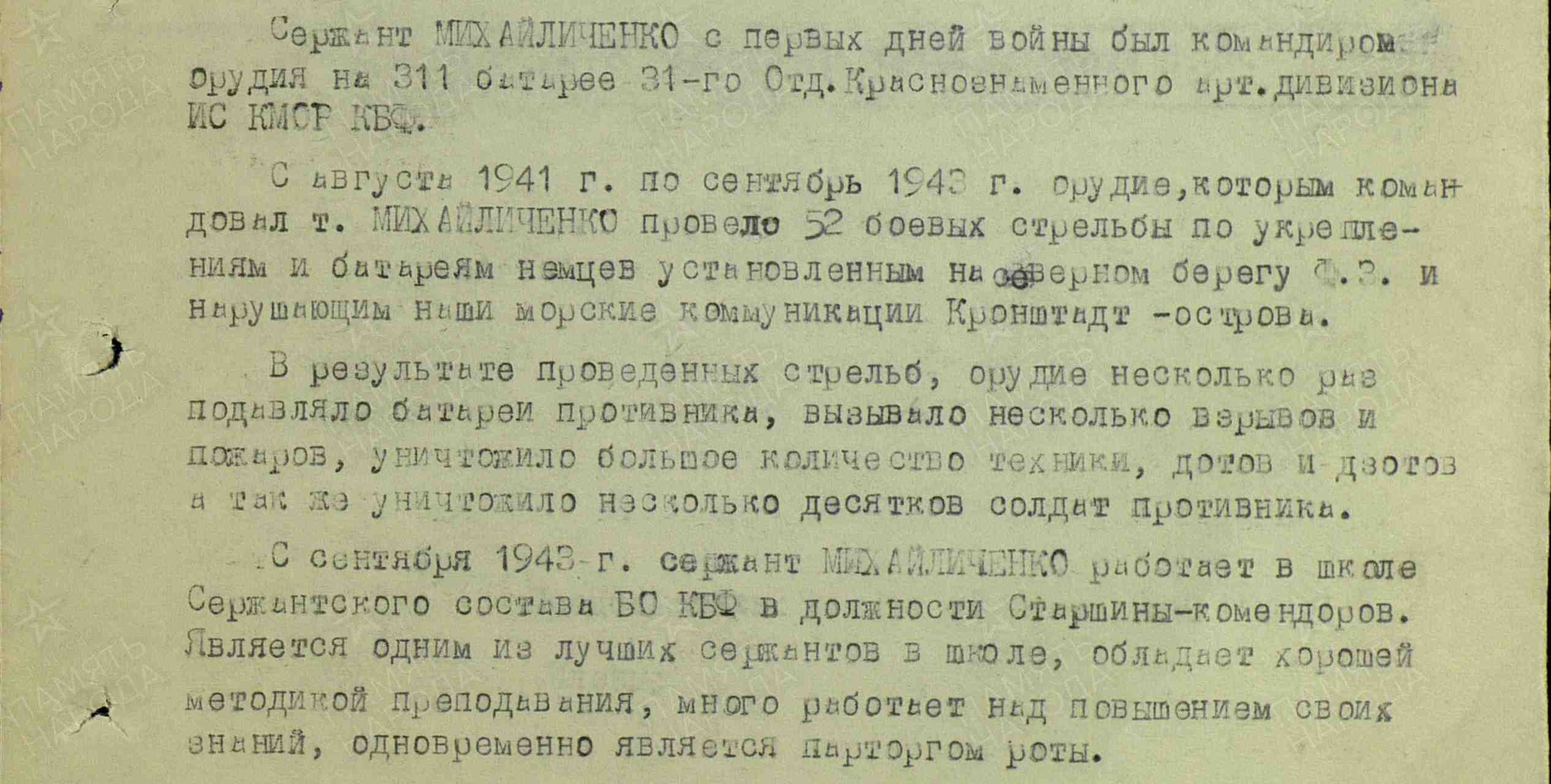 «... Сержант МИХАЙЛИЧЕНКО с первых дней войны был командирован орудия на 311 батарее 31-го Отд. Краснознаменного арт. дивизиона ИС КМОР КБФ. С августа 1941 г. по сентябрь 1943 г. орудие, которым командовал т. МИХАЙЛИЧЕНКО провело 52 боевых стрельбы по укреплениям и батареям немцев установленным на северном берегу Ф.3. и нарушающим наши морские коммуникации Кронштадт -острова. результате проведенных стрельб, орудие несколько раз подавляло батареи противника, вызывало несколько взрывов и пожаров, уничтожило большое количество техники, дотов и дзотов в так же уничтожило несколько десятков солдат противника. С сентября 1943 г. сержант МИХАЙЛИЧЕНКО работает в школе Сержантского состава БО КБФ в должности Старшины-комендоров. Является одним из лучших сержантов в школе, обладает хорошей методикой преподавания, много работает над повышением своих знаний, одновременно является парторгом роты. Курсанты воспитанные т. МЕХАЙЛИЧЕНКО на всех экзаменых показали высокие знания по специальности. ...»