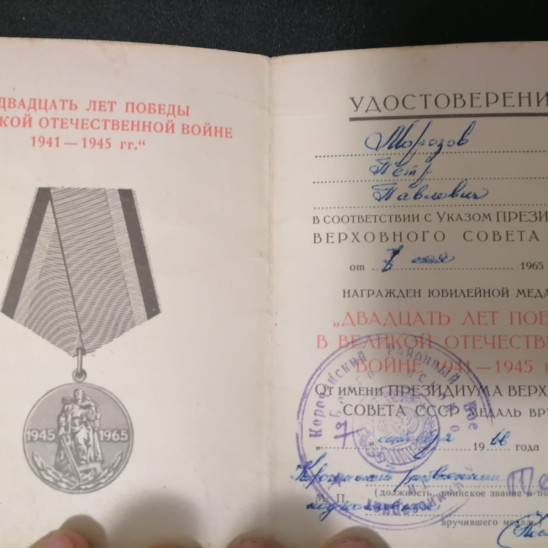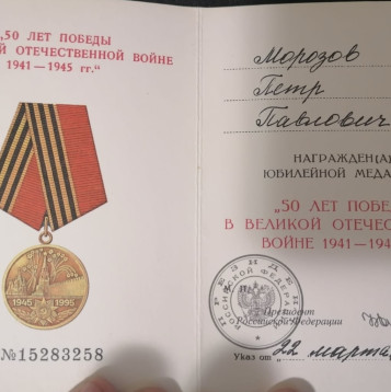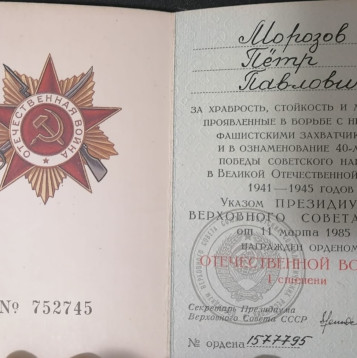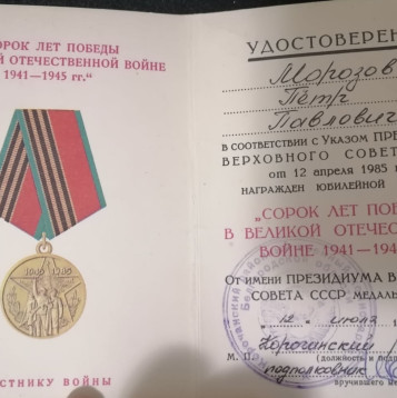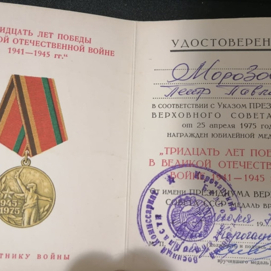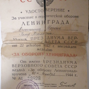 Морозов Петр Павлович был призван Калмыцким РВК Ростовской области в ряды советской армии в 1941 году военным инженером (сапером). В его обязанности входила не только очистка территории от взрывоопасных предметов или наоборот, создание минных полей на пути вражеской армии, сдерживающих наступление. Он с боевыми товарищами рыл траншеи, делал проходы в минно-взрывных зонах на территории противника, организовывал переправы через водные преграды... Активно принимал участие в борьбе с немецко-фашистскими захватчиками, при выполнении разминирования полей в районе с. Колпино Ленинградской области был дважды ранен. Третье ранение получил в районе Петергофа в 1941 году во время разминирования вражеских мин, участвовал в освобождении Ленинграда, дошел до Кёнигсберга. 15 августа 1944 года в районе города Выру (Эстония) при активном налете авиации противника отразил налет, будучи раненым не ушел с поля боя. 18 сентября 1944 года при налете авиации а районе Този (Тоотси Эстония) был ранен вторично и госпитализирован. 22 апреля 1944 года бал награжден Медалью "За боевые заслуги", 30 сентября 1944 года - Медалью "За отвагу". В 1985 году был представлен к награде - Орден Отечественной войны 1 степени. Морозов Петр Павлович прошел всю войну, но до конца жизни оставался оптимистом, ко всему относился с юмором. Был главой большого семейства - отцом пятерых сыновей.