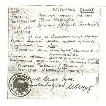 Морозов Пётр Яковлевич родился 20 июня 1901 года в деревне Носково, Каменского района, Тверской области. Призван в ряды советской армии в 1941 году. Ушёл на фронт оставив дома мать, жену и четырёх дочерей. Сражался на Ленинградском фронте в звании сержанта. Героически погиб 23 августа 1943 года. Похоронен в братской могиле южнее озера Глухое, Мшинского района, Ленинградской области. Помним, любим и гордимся! Светлая тебе память! Дети, внуки, правнуки.