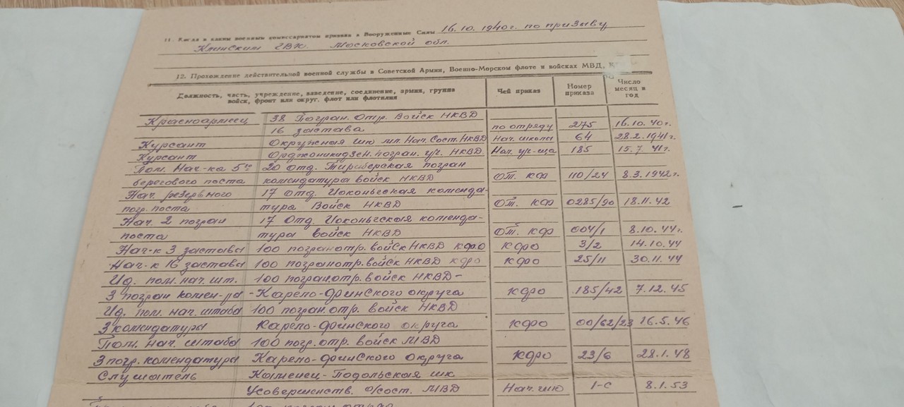14 ноября 1953 г. - 25 июня 1954 г. занимал должность помощника начальника штаба 9-й комендатуры 100-го пограничного отряда войск МВД.