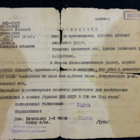 В начале 1943 г. по исполнении 18-ти лет отказался от брони и ушел добровольцем на фронт вместе с двумя товарищами. Погиб в сентябре 1943 г. в первом и последнем для него бою.