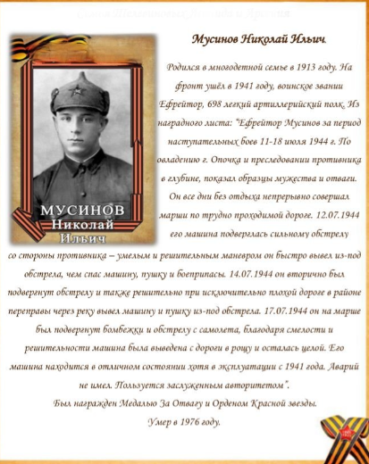 Мусинов Николай Ильич. Родился в многодетной семье в 1913 году. На фронт ушёл в 1941 году, воинское звании Ефрейтор, 698 легкий артиллерийский полк. Из наградного листа: “Ефрейтор Мусинов за период наступательных боев 11-18 июля 1944 г. По овладению г. Опочка и преследовании противника в глубине, показал образцы мужества и отваги. Он все дни без отдыха непрерывно совершал марши по трудно проходимой дороге. 12.07.1944 его машина подверглась сильному обстрелу со стороны противника – умелым и решительным маневром он быстро вывел из-под обстрела, чем спас машину, пушку и боеприпасы. 14.07.1944 он вторично был подвергнут обстрелу и также решительно при исключительно плохой дороге в районе переправы через реку вывел машину и пушку из-под обстрела. 17.07.1944 он на марше был подвергнут бомбежки и обстрелу с самолета, благодаря смелости и решительности машина была выведена с дороги в рощу и осталась целой. Его машина находится в отличном состоянии хотя в эксплуатации с 1941 года. Аварий не имел. Пользуется заслуженным авторитетом”. Был награжден Медалью За Отвагу и Орденом Красной звезды. Умер в 1976 году.
