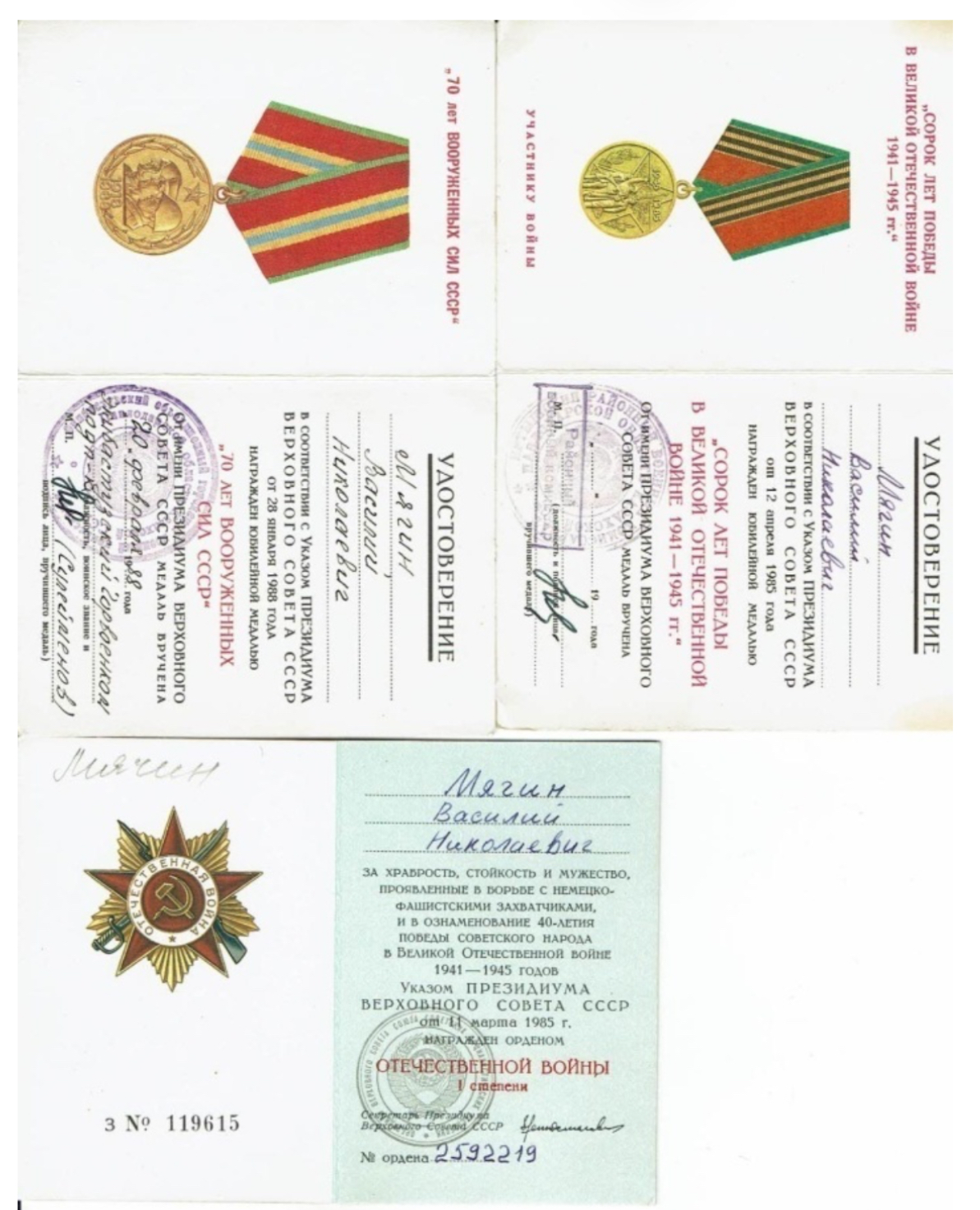Мячин Василий Николанвич, родился в 1921 году 8 августа в Кировской области Молотовского района. После окончания школы пошел работать шофером. В 1940 году призвали в армию с Кировской области, Нолинского района. Служил в Инкермане под Севастополем, шофером в звании рядового. Там его и застала война и он начал защищать Крым от фашистов. В годы Великой Отечественной войны Василий Николаевич подвозил на фронт под Севастополь на передовую снаряды, боевую технику и продукты, а также перевозил раненых красноармейцев в госпиталь г. Поти Грузия, а обратно в Севастополь привозил уже здоровых бойцов на фронт. В 1942 году за Севастополь шли ожесточенные бои, город был окружен фашистами. Колонна машин двигаясь в город Севастополь, наткнулась на высадившихся в то время вооруженных немецких десантников. Немцы стали в упор стрелять по нашим машинам. Не у всех оказалось было оружие, защищаться было не чем. Рядовой Мячин В.Н. находился как раз в первых рядах этой колонны. Получил тяжелое ранение и очень долго лежал на лечении в госпитале. Очень много тогда погибло солдат, но его спасли красноармейцы. По пути в госпиталь по морю немецкие бомбардировщики бомбили корабли, на которых перевозили раненых, но все таки большая часть раненых смогла добраться до г. Поти. После госпиталя, рядового Мячина В.Н. комиссовали по состоянию здоровья, но он остался в тылу и помогал в борьбе с фашизмом. В то время в Персидский залив приходили торговые суда, это была помощь Американцев Советскому Союзу и он стал перевозить на автомашине военные грузы с Персидского залива через Иран в СССР. Был награжден медалью и Орденом Отечественной Войне 1 степени. Так же он был награжден к 40 летию победы в Великой Отечественной Войне и 70-летию Вооруженных сил СССР - медалями. Умер в 1988 году.