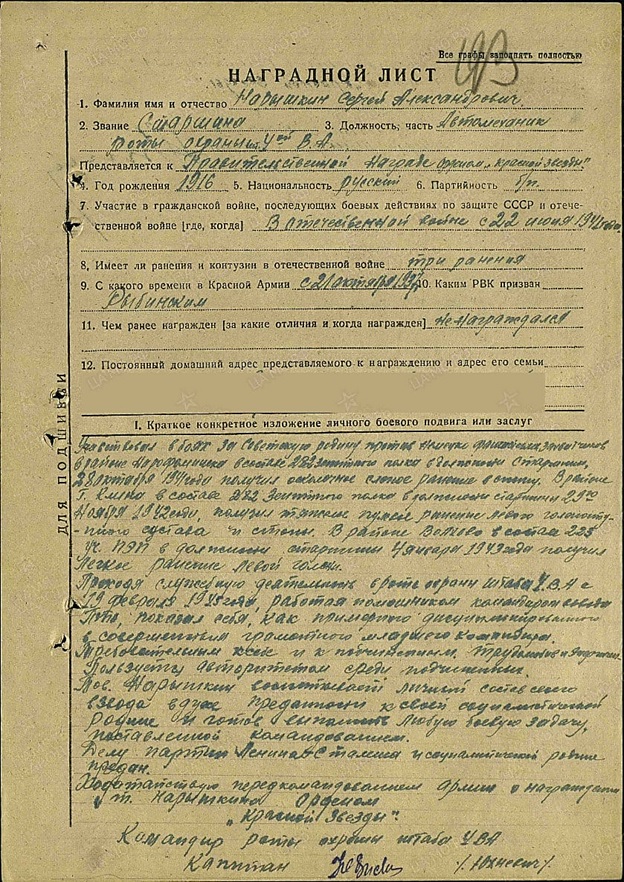 Звание: старшина в РККА с 21.10.1937 года Место призыва: Рыбинский РВК, Ярославская обл., Рыбинский р-н Место службы: штаб 4 ВА Дата подвига: 28.10.1941, 29.11.1942, 04.01.1943, 19.02.1945-29.04.1945 Три ранения Орден "Красной Звезды"