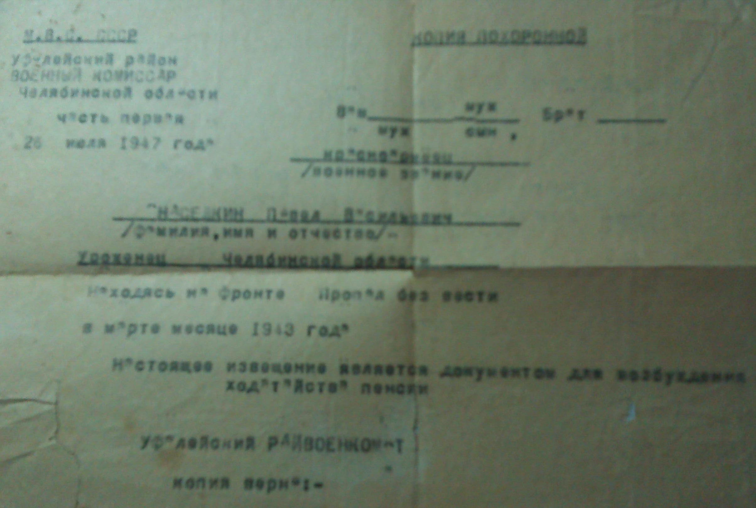 от времени извещение о том, что красноармеец Наседкин Павел Васильевич 1904 года рождения