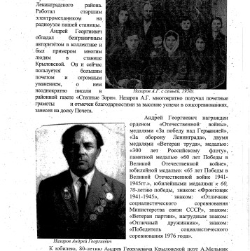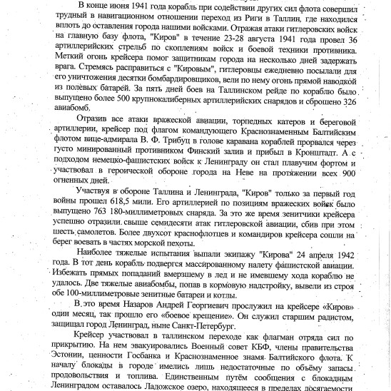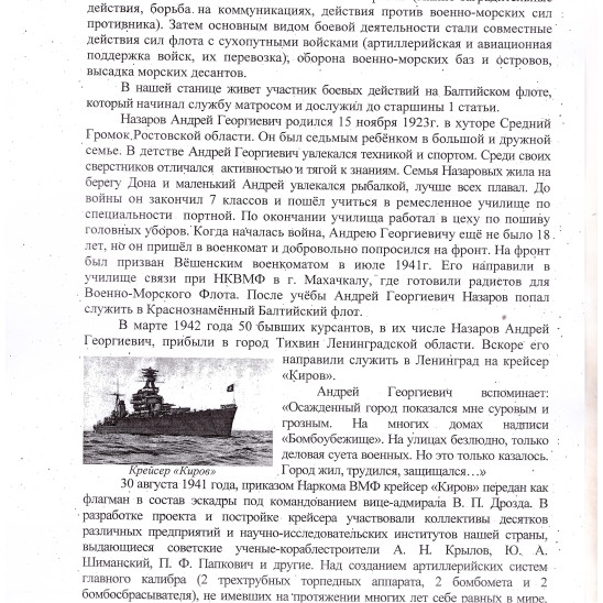Когда началась война еще не было 18 лет. Добровольно попросился на фронт. Был призван Вёшенским военкоматом в июле 1941 года. Направили в училище связи при НКВД в г.Махачкалу. После учебы попал служить в Краснознаменный Балтийский флот. В 1942 г. направили служить в Ленинград на крейсер "Киров" старшим радистом. Попал под обстрел авиации. В результате проводимых немцами операций "Айсштосс" и "Гец фон Берлихинген" крейсер получил 4 прямых бомбовых (250 кг) и 1 артиллерийское попадание. Через 2 месяца крейсер был полностью восстановлен. 17.10.1945 г. под Кронштадтом крейсер "Киров" подорвался на донной магнитной мине. 7 буксиров завели крейсер в док. Там его караулила немецкая подводная лодка, которую в дальнейшем он и уничтожил. Крейсер был в ремонте. Матросов списали. Попал на тральщик 163 Краснознаменного Балтийского флота. Очищал Балтийское море от глубинных мин в г.Таллин, Рига, Либава, Клайнеда, Кенингсберг, Дансинг, Пелау, Гдыня. В 1948 г. демобилизовался.