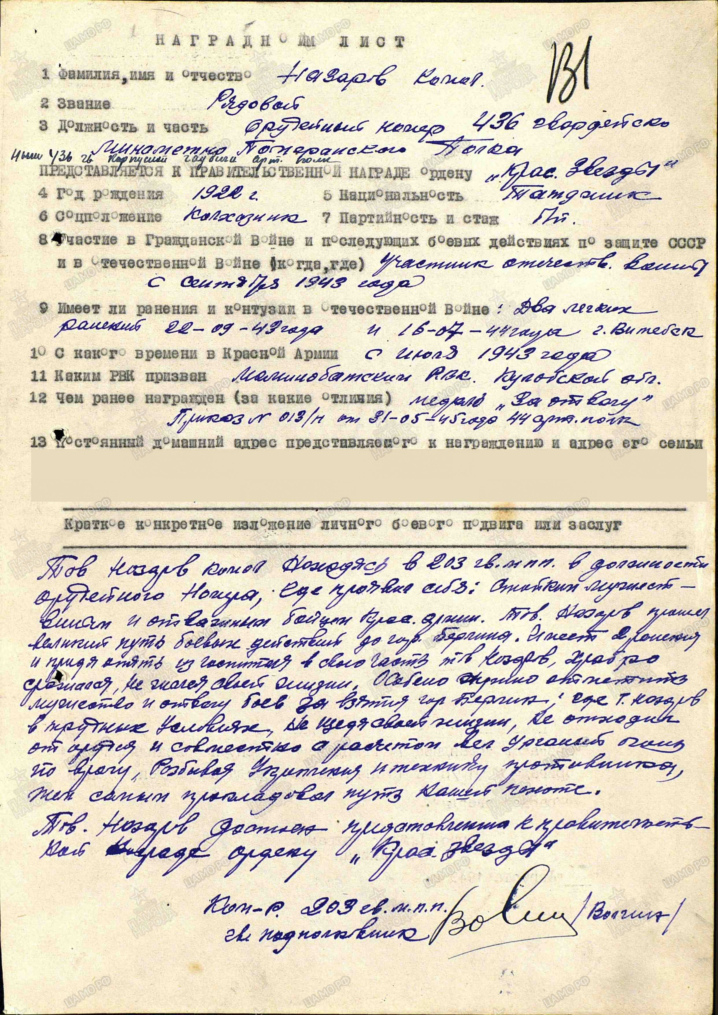 Назаров Камол родился 22.02.1922 года в селе Шамолдара Муминабадского района Таджикской ССР. Был призван на защиту Родины вместе со своими братьями в ряды Красной Армии 21.03.1942 года и был задействован в качестве стрелка, наводчика пулемётного расчёта и в качестве орудийного номера (подносчика патронов) 85мм., 122мм. и 152мм. пушек и гаубиц на Первом Украинском, Первом и Втором Белорусском, Втором Прибалтийском, Калининском и Западном фронтах на территории РСФСР, Украины, Белоруссии, Литвы, Латвии, Польши, Германии. Службу проходил в составе 530-го Стрелкового полка 156-й Стрелковой дивизии; 44-го артиллерийского полка, 33-й стрелковой, краснознамённой, Холмско-Берлинской ордена Суворова 2-й степени дивизии; 203-го Гвардейского артиллерийского Померанского армейского миномётного полка; 436-го гвардейского артиллерийского Померанского ордена А.Невского полка 74-й гвардейской артиллерийской бригады.За годы войны им были уничтожены большое количество противников. Так, только 4-го июля 1944 года будучи наводчиком пулемётного расчёта пулемётной роты 2-го стрелкового батальона 530-го Стрелкового полка 156-й Стрелковой дивизии 2-го Прибалтийского фронта при наступлении на селение Фалевичи Витебской области Белорусской ССР, меткой очередью уничтожил 3-х автоматчиков противника. Слаженными действиями дивизии населённый пункт был освобождён от фашистов. В ходе боёв Назаров Камол неоднократно был ранен; (22.09.1943г., 16.07.1944г., 10.11.1944г.), но не смотря на это, после излечения вновь встал в строй однополчан. В 1945 году Назаров Камол в составе 203-го Гвардейского артиллерийского Померанского армейского миномётного полка 3-й Ударной армии был задействован в проведении Берлинской наступательной операции на территории Германии в качестве орудийного номера гаубицы. Назаров Камол совместно с расчётом вёл ураганный бой по врагу, разбивая укрепления и технику противника, тем самым прокладывая путь Советской пехоте. За эти подвиги Назаров К. был награждён орденом «Красной звезды» и дважды медалью «За отвагу». Также Назаров К. был награждён орденом «Отечественной войны II-й степени», медалью «За боевые заслуги», медалью «За взятие Берлина», медалью «За победу над Германией в ВОВ 1941-1945гг.», медалью «Жукова», медалью «Ветеран Труда» и другими правительственными наградами.Назаров Камол вернулся с фронта в свою родную деревню только через полтора года после окончания войны в ноябре 1946 года. После возвращения с фронта Назаров К. женился и вырастил 10-х детей. Работал вначале почтальоном, а с 1953 год до выхода на пенсию работал пчеловодом. Назаров Камол свою жизнь прожил так, что был образцом мужества и человечности для подражания молодёжи. Назаров Камол скончался 19 апреля 2012 года, на 91-м году жизни.