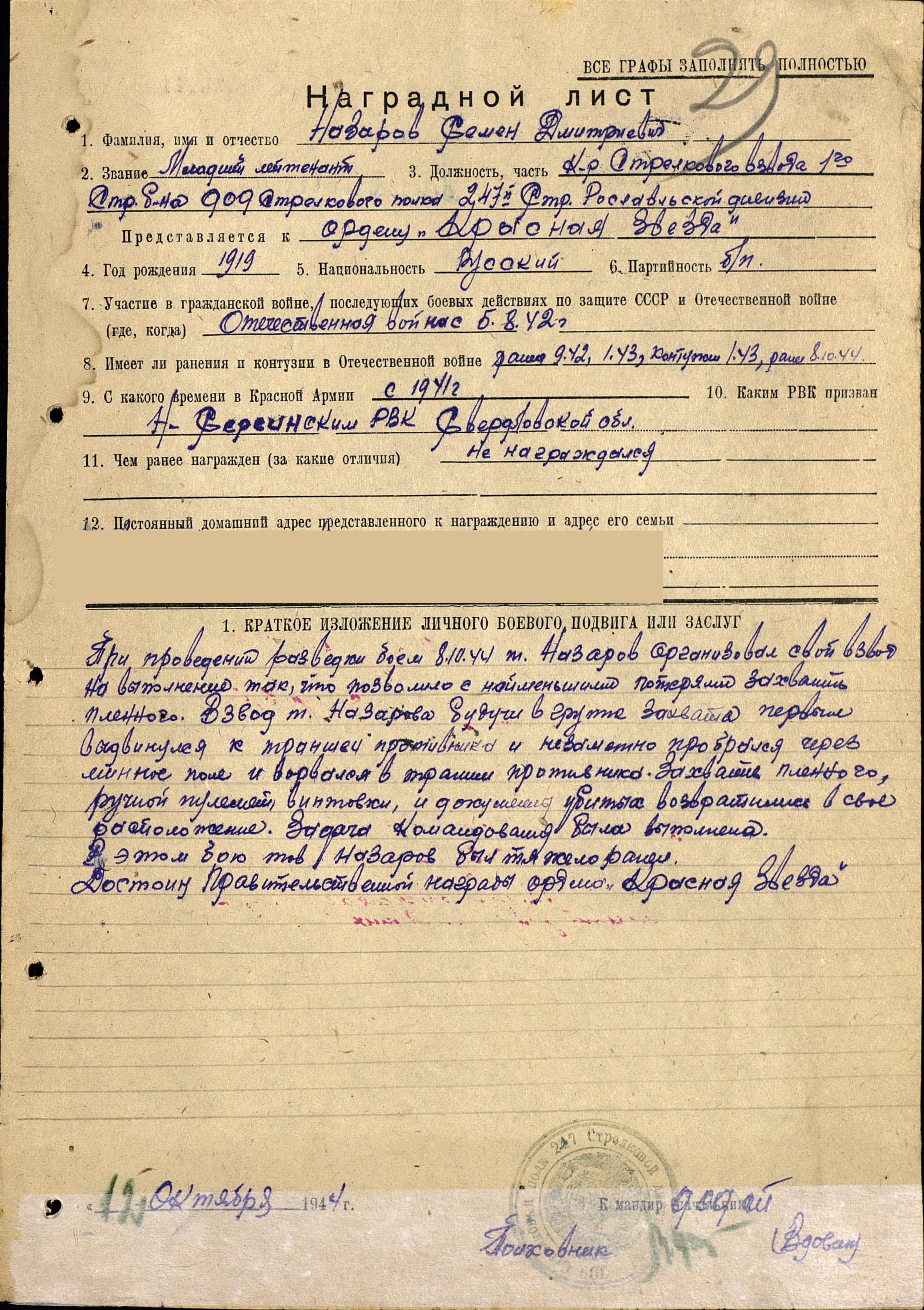 1944 году был командиром взвода 909 стрелкового полка 247 стрелковой