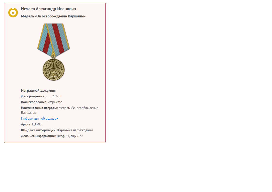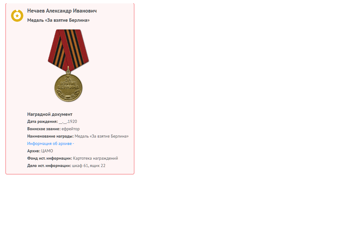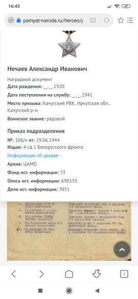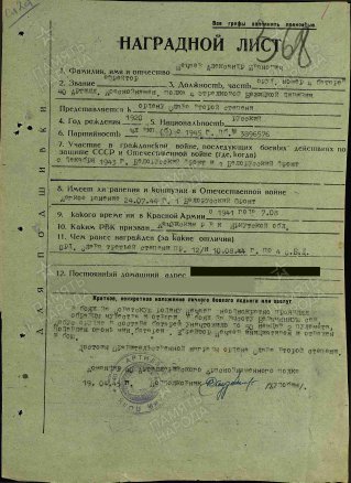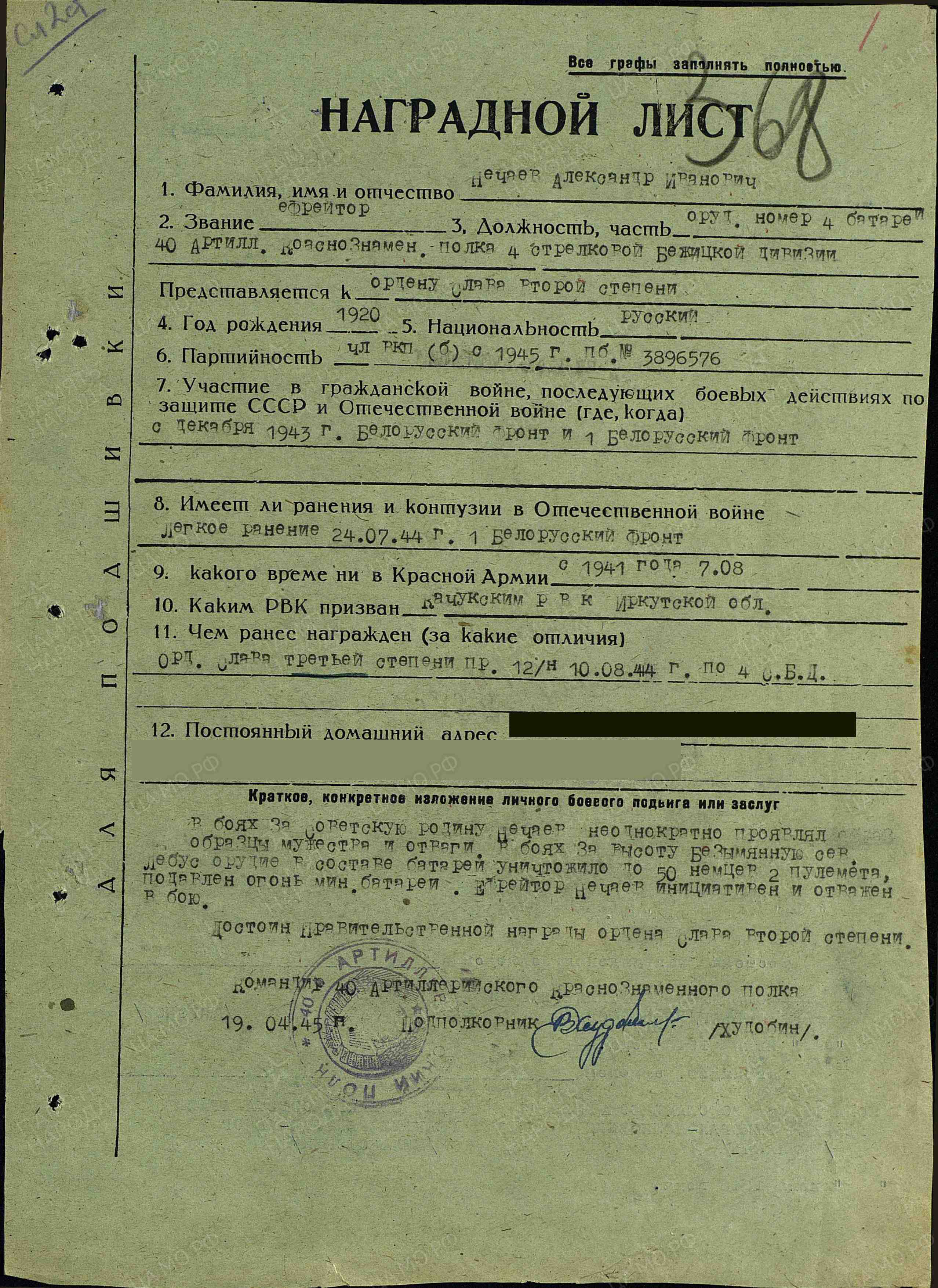 Александр Иванович родился в 1920 году, на военную службу был призван 07 августа 1941 года Качугским РВК Иркутской области. Начал свой военный путь рядовым артиллерийского расчета. Закончил войну в звании ефрейтора. Прошел всю войну. Был ранен. Награжден Орденами Славы II и III степени, Медалью за взятие Берлина, медалью за освобождение Варшавы.