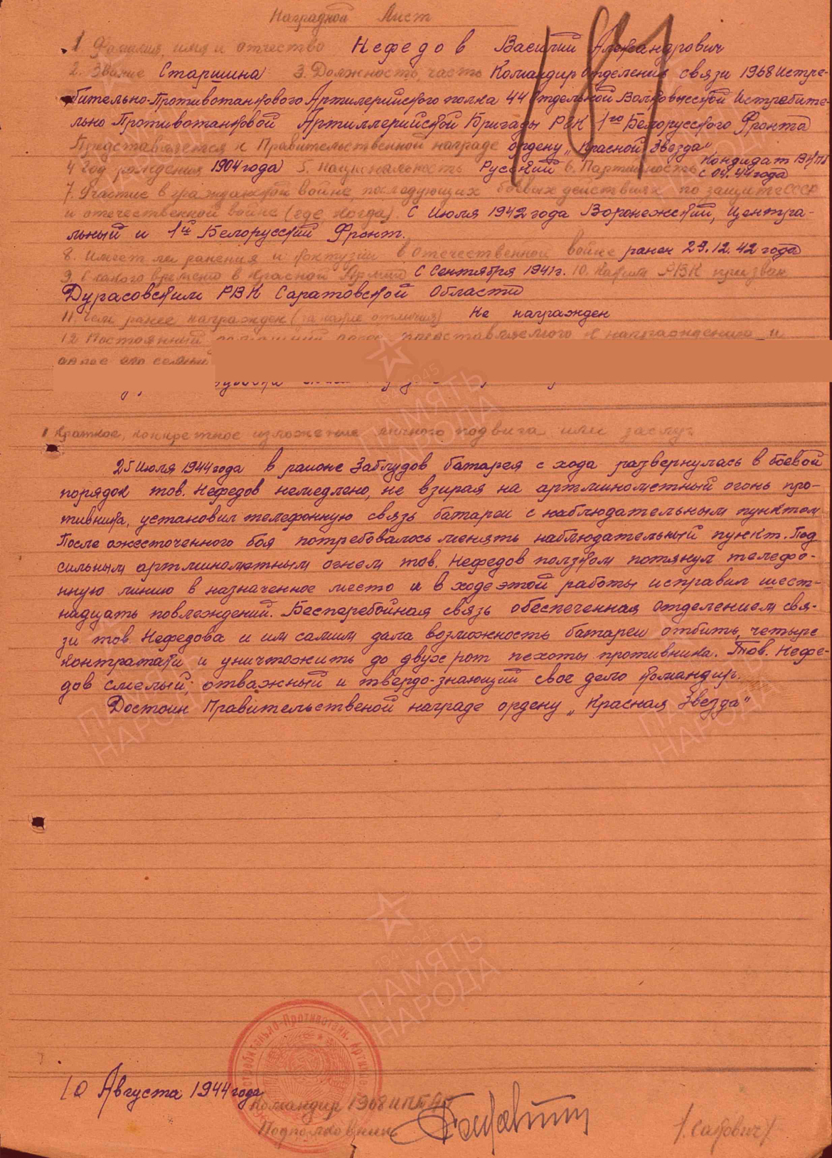 Командир отделения связи 1968 истребительно-противотанкового артиллерийского полка. Два раза переходил линию фронта, там же получил осколочное ранение Дважды был награжден Орденом Красной Звезды и Медалью «За победу над Германией в Великой Отечественной войне 1941–1945 гг.». 25 июля 1944 года в районе Заблудов батарея с хода развернулась в боевой порядок тов. Нефедов немедлено, не взирая на артминометный огонь противника, установил телефонную связь батареи с наблюдательным пунктом. После ожесточенного боях потребовалось менять наблюдательный пункт. Под сильным артминометным огнем тов. Нефедов ползком потянул телефонную линию в назначенное место и ходе этой работы исправил шест надцать повлеждений. Бесперебойная связь обеспеченная отделением связа тов. Нефедова и им самим дала возможность батареи отбить четыре контратаки и уничтожить до двух рот пехоты противника. Тов. Нефедов смелый отважный и твердо знающий свое дело командир. ...» После ВОВ участвовал в Советско-Японской войне Умер в 1979 году от блуждающего осколка в легком