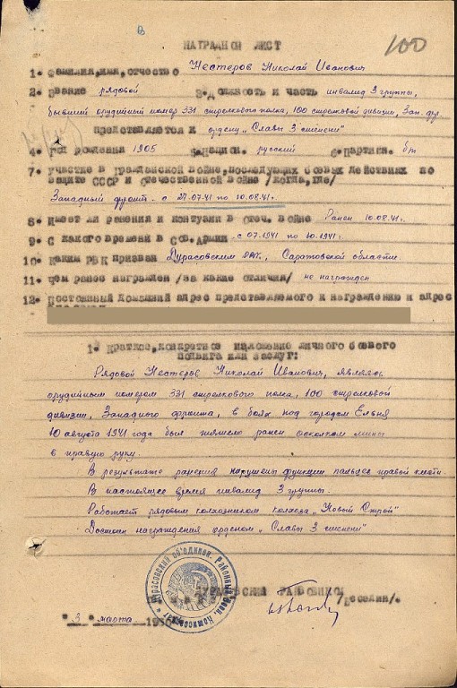 Мой прадед Нестеров Николай Иванович родился в мае 1905 года в многодетной семье крестьянина Аткарского уезда села Большая Рельня Нестерова Ивана Нестеровича и Пелагеи Яковлевны (Букиной). В семье кроме прадеда было ещё четверо детей старший Иван, Валентина, Александр, Василий. Женившись на Марии Сергеевне (Егоровой) перебрался в посёлок Новая Жизнь расположившийся на берегу пруда Совиный. У прадеда родилось трое детей Владимир, Надежда (моя бабушка), Бронислав. Когда началась война был мобилизован на фронт. Участвовал в боях под Ельней, где получил тяжёлое ранение в руку и был комиссован.