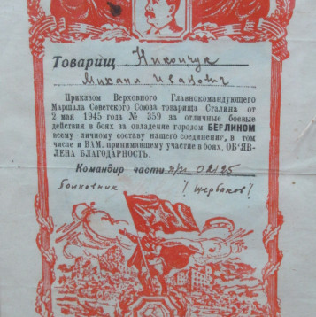 - 23 апреля 1945 г. Благодарность «за прорыв обороны немцев