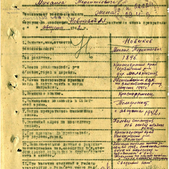 Полевая станция, 1116 особая штабная рота. Последнее письмо родным в 1942 году, перед боем. После этого боя сведений о нем нет, пропал без вести.